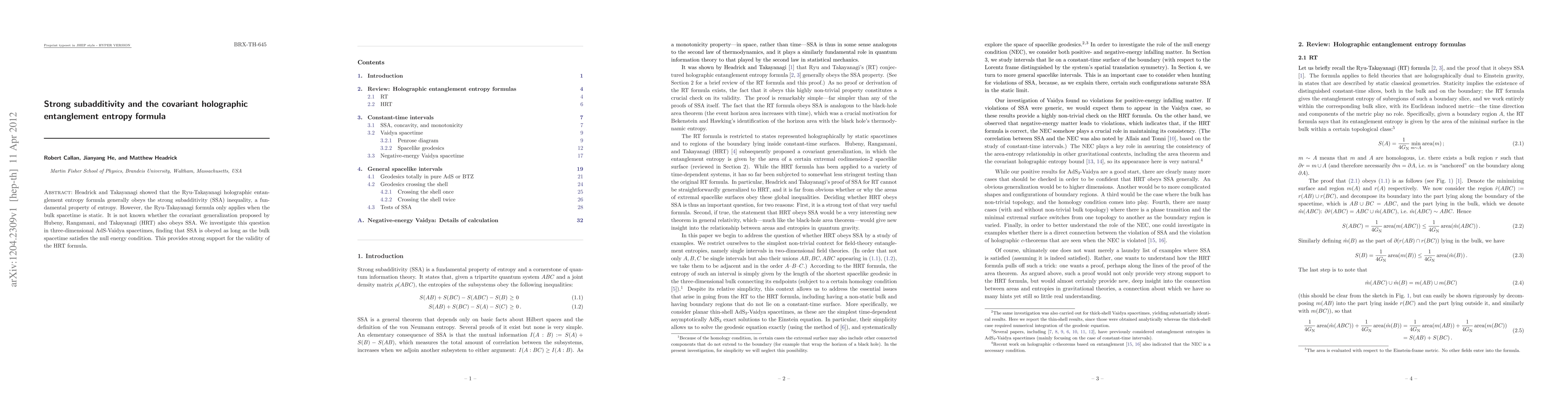 This paper investigates whether the covariant holographic entanglement entropy formula, proposed by Hubeny, Rangamani, and Takayanagi (HRT), obeys the strong subadditivity inequality in three-dimensional AdS-Vaidya spacetimes. The authors find that the inequality holds as long as the null energy condition is satisfied, thereby supporting the validity of the HRT formula.