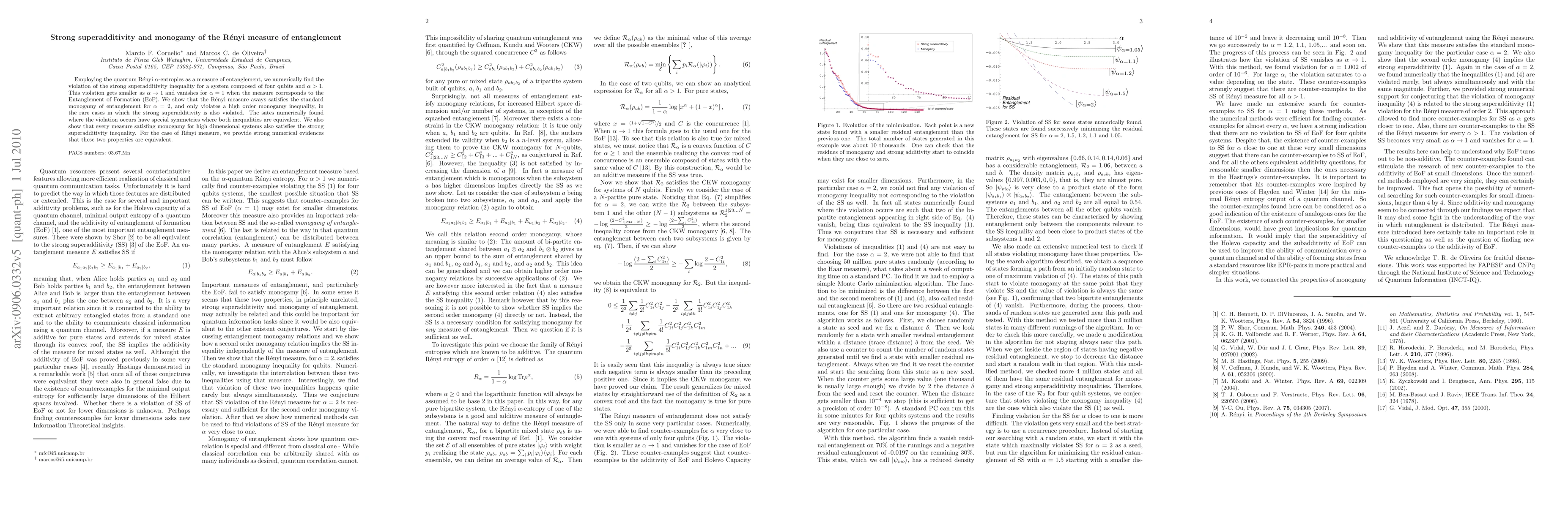 Employing the quantum R\'enyi $\alpha$-entropies as a measure of entanglement, we numerically find the violation of the strong superadditivity inequality for a system composed of four qubits and $\alpha>1$. This violation gets smaller as $\alpha\rightarrow 1$ and vanishes for $\alpha=1$ when the measure corresponds to the Entanglement of Formation (EoF). We show that the R\'enyi measure aways satisfies the standard monogamy of entanglement for $\alpha = 2$, and only violates a high order monogamy inequality, in the rare cases in which the strong superadditivity is also violated. The sates numerically found where the violation occurs have special symmetries where both inequalities are equivalent. We also show that every measure satisfing monogamy for high dimensional systems also satisfies the strong superadditivity inequality. For the case of R\'enyi measure, we provide strong numerical evidences that these two properties are equivalent.