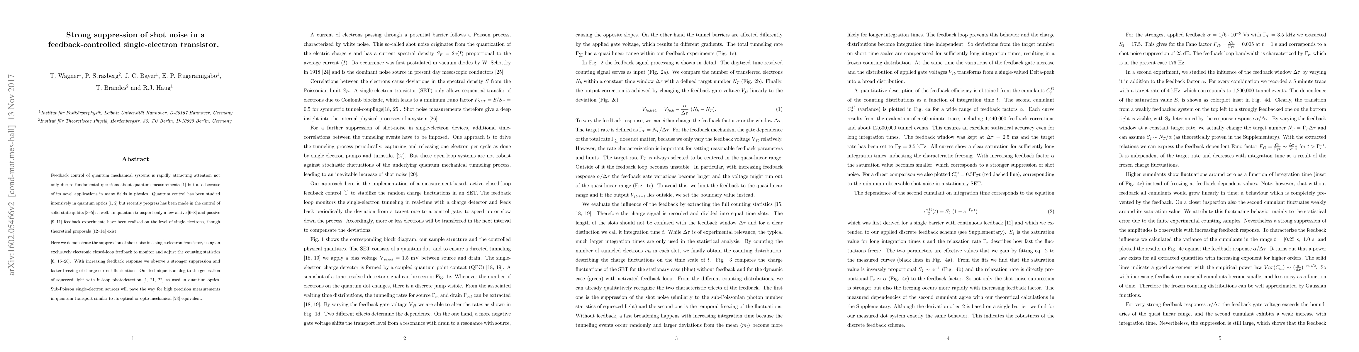 This paper demonstrates the suppression of shot noise in a single-electron transistor using electronic feedback control, achieving stronger suppression and faster freezing of charge current fluctuations with increased feedback. The technique parallels the generation of squeezed light in quantum optics, potentially paving the way for high precision measurements in quantum transport.