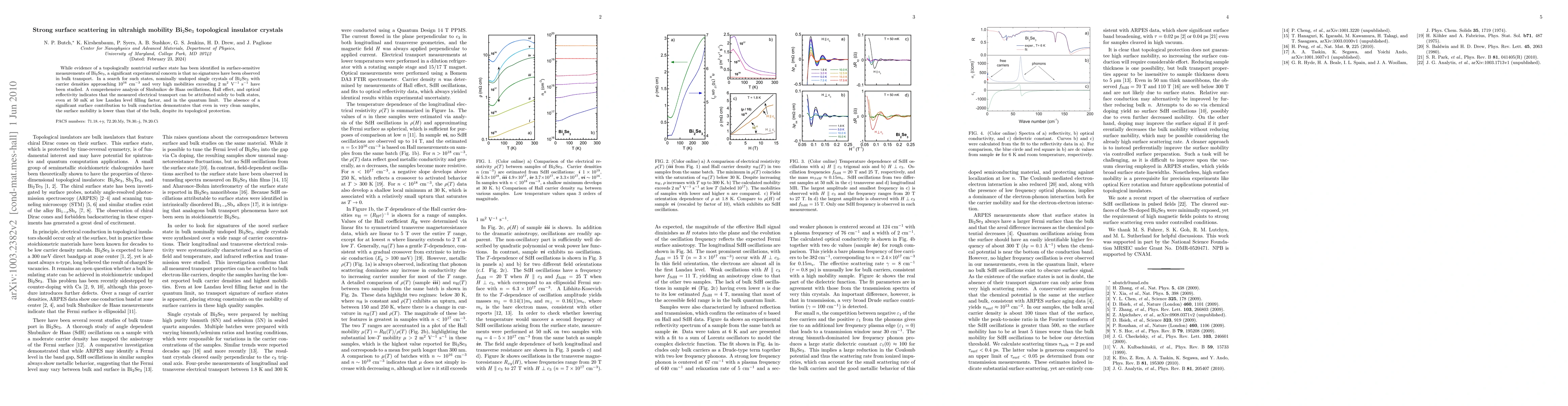 This paper investigates ultrahigh mobility Bi2Se3 topological insulator crystals, finding that despite topological protection, surface scattering is strong, leading to lower surface mobility than bulk. Comprehensive transport analysis shows bulk states dominate conduction, with no significant surface contribution even at low temperatures.