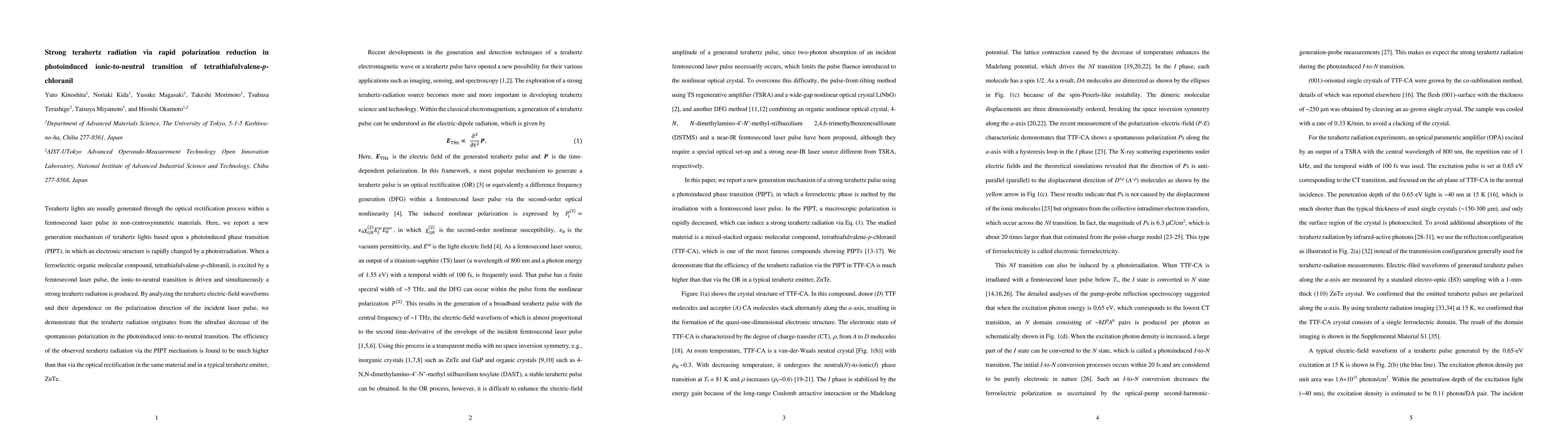 This paper reports a novel mechanism for generating strong terahertz radiation through a photoinduced phase transition in tetrathiafulvalene-p-chloranil, where rapid polarization reduction during an ionic-to-neutral transition leads to efficient terahertz emission, significantly outperforming traditional optical rectification methods.