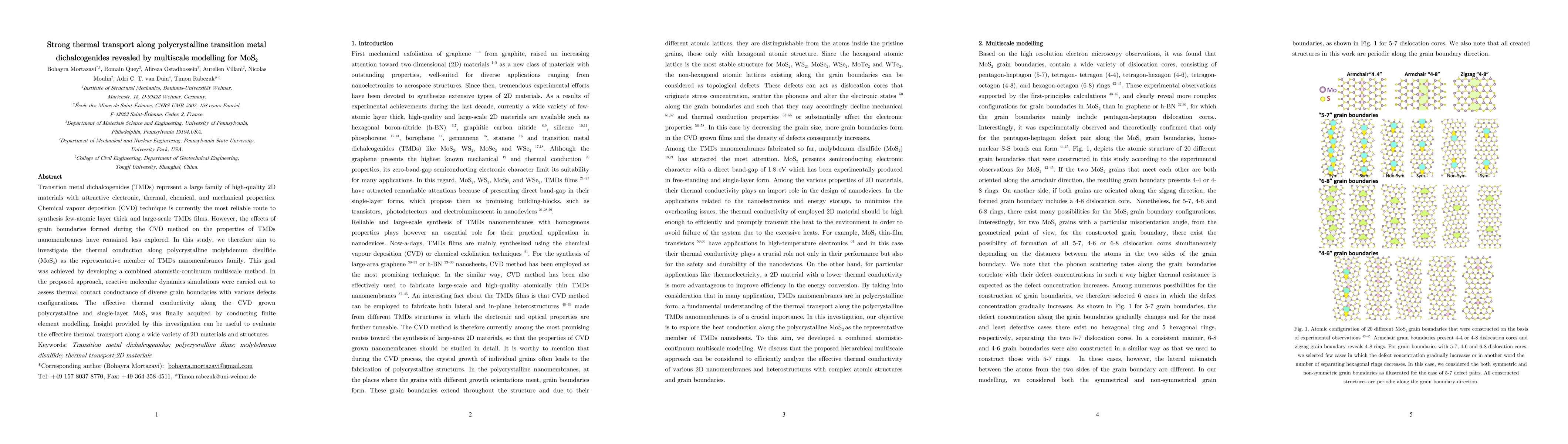 This study investigates thermal conduction in polycrystalline MoS2 nanomembranes using multiscale modelling, revealing strong thermal transport despite grain boundaries. The research combines reactive molecular dynamics and finite element modelling to assess thermal contact conductance and effective thermal conductivity.