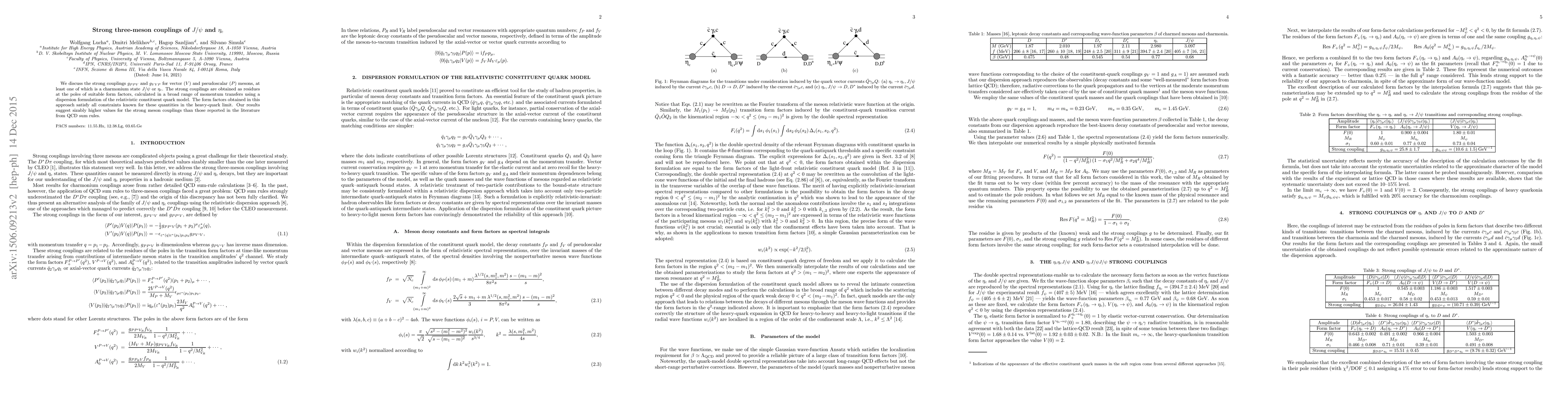 We discuss the strong couplings $g_{PPV}$ and $g_{VVP}$ for vector ($V$) and pseudoscalar ($P$) mesons, at least one of which is a charmonium state $J/\psi$ or $\eta_c$. The strong couplings are obtained as residues at the poles of suitable form factors, calculated in a broad range of momentum transfers using a dispersion formulation of the relativistic constituent quark model. The form factors obtained in this approach satisfy all constraints known for these quantities in the heavy-quark limit. Our results suggest sizably higher values for the strong meson couplings than those reported in the literature from QCD sum rules.