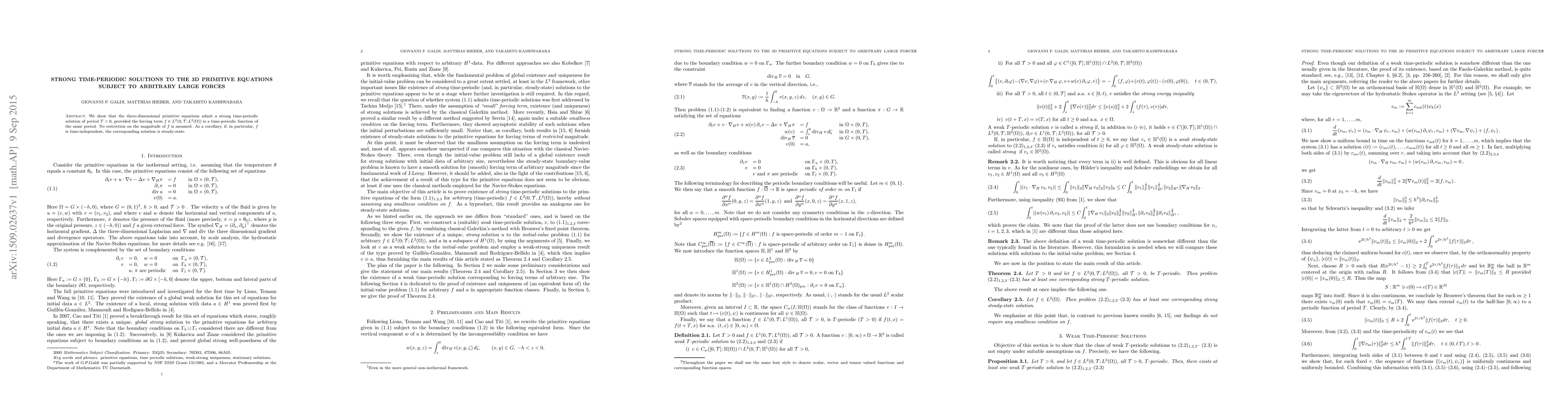 We show that the three-dimensional primitive equations admit a strong time-periodic solution of period $T>0$, provided the forcing term $f\in L^2(0,\mathcal T; L^2(\Omega))$ is a time-periodic function of the same period. No restriction on the magnitude of $f$ is assumed. As a corollary, if, in particular, $f$ is time-independent, the corresponding solution is steady-state.