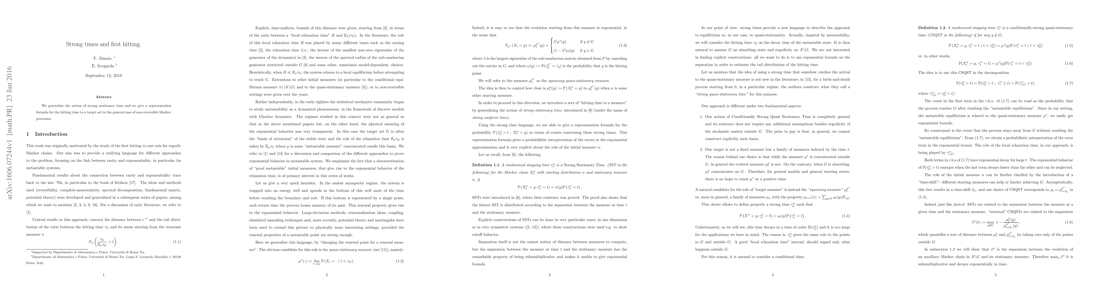 We generalize the notion of strong stationary time and we give a representation formula for the hitting time to a target set in the general case of non-reversible Markov processes.