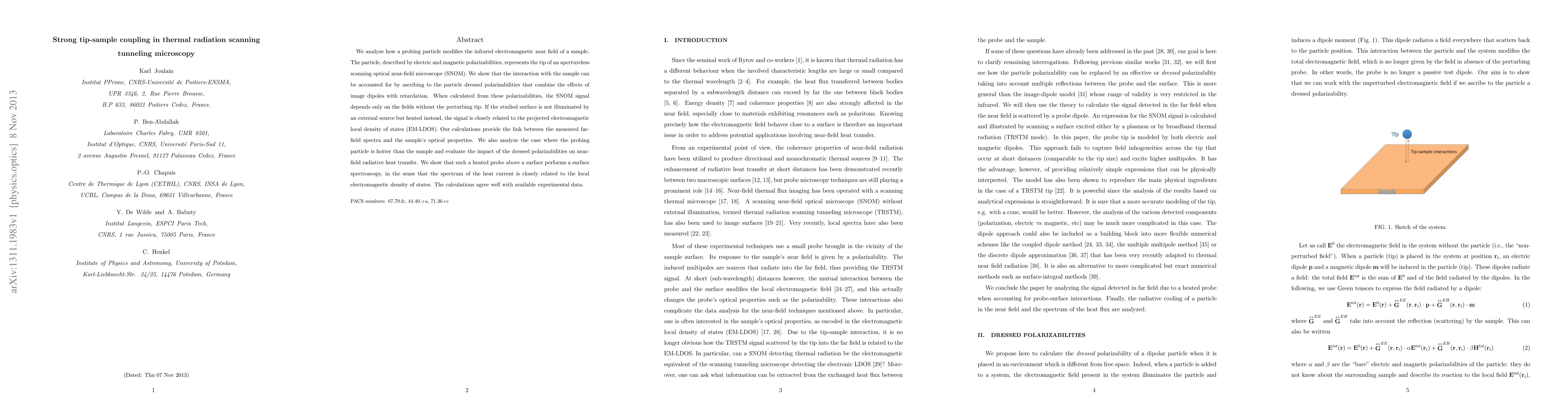 Researchers found that a probing particle in thermal radiation scanning tunneling microscopy affects the electromagnetic near field of a sample through dressed polarizabilities, enabling a link between measured far-field spectra and sample properties.