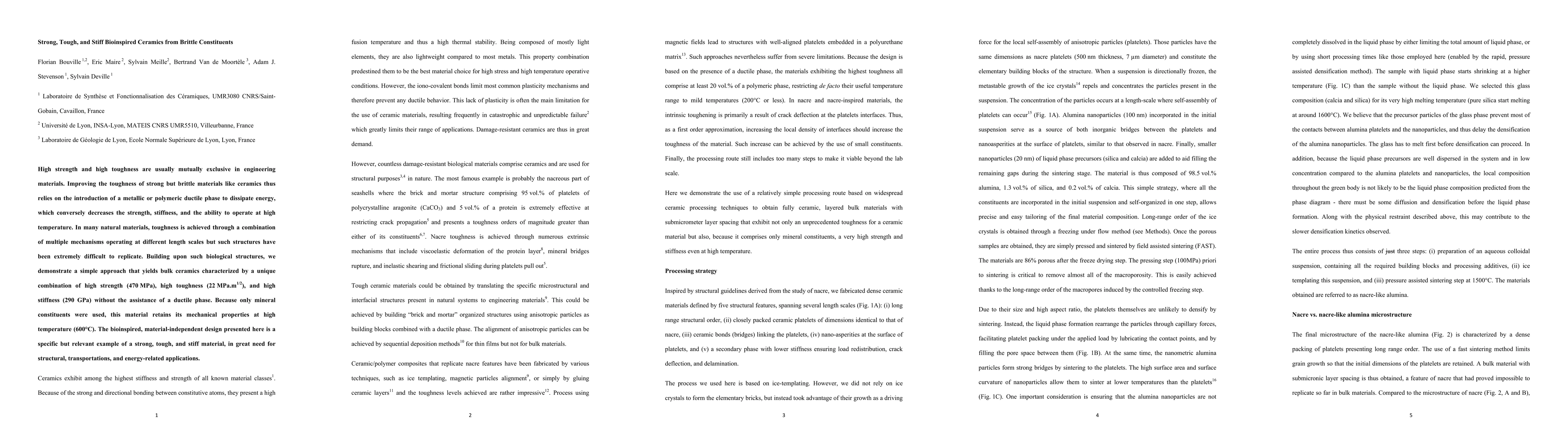 This paper introduces a bioinspired method to create ceramics that simultaneously achieve high strength, toughness, and stiffness, using only brittle mineral constituents, without sacrificing high-temperature performance. The resulting material, with impressive mechanical properties, demonstrates a novel design applicable across various structural and energy sectors.
