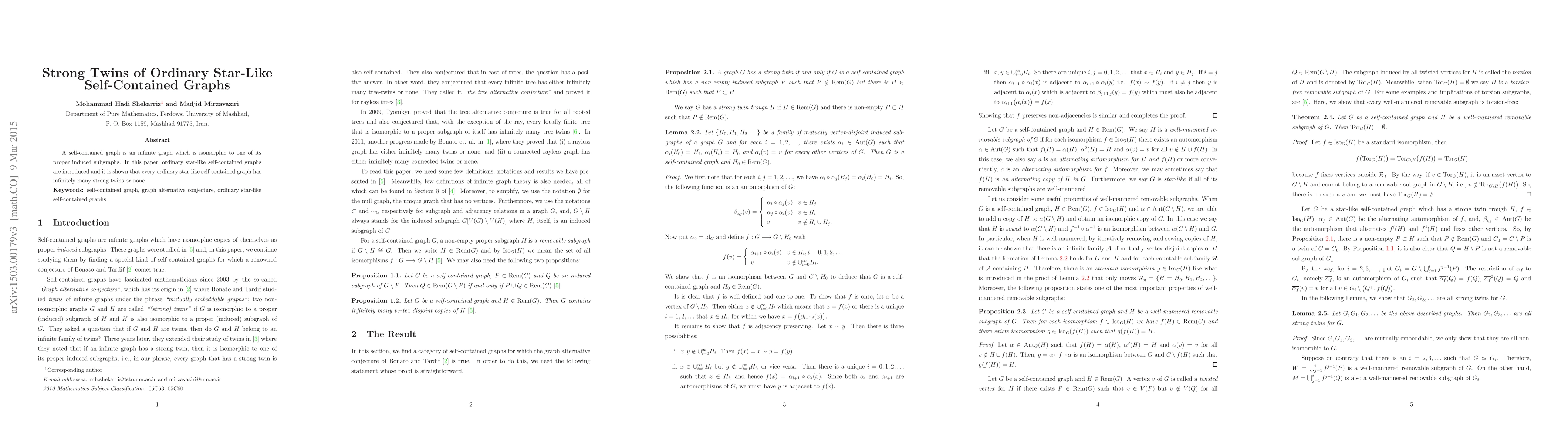 A self-contained graph is an infinite graph which is isomorphic to one of its proper induced subgraphs. In this paper, ordinary star-like self-contained graphs are introduced and it is shown that every ordinary star-like self-contained graph has infinitely many strong twins or none.