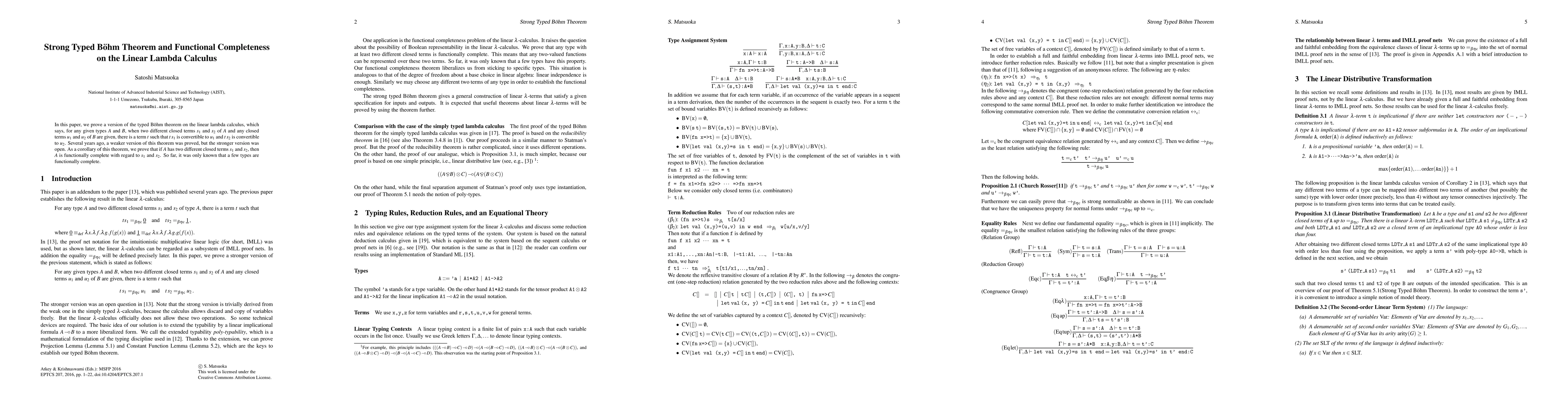 The paper proves a stronger version of the typed Böhm theorem on the linear lambda calculus, utilizing poly-types for composability of terms and demonstrating functional completeness for types with two distinct closed terms.