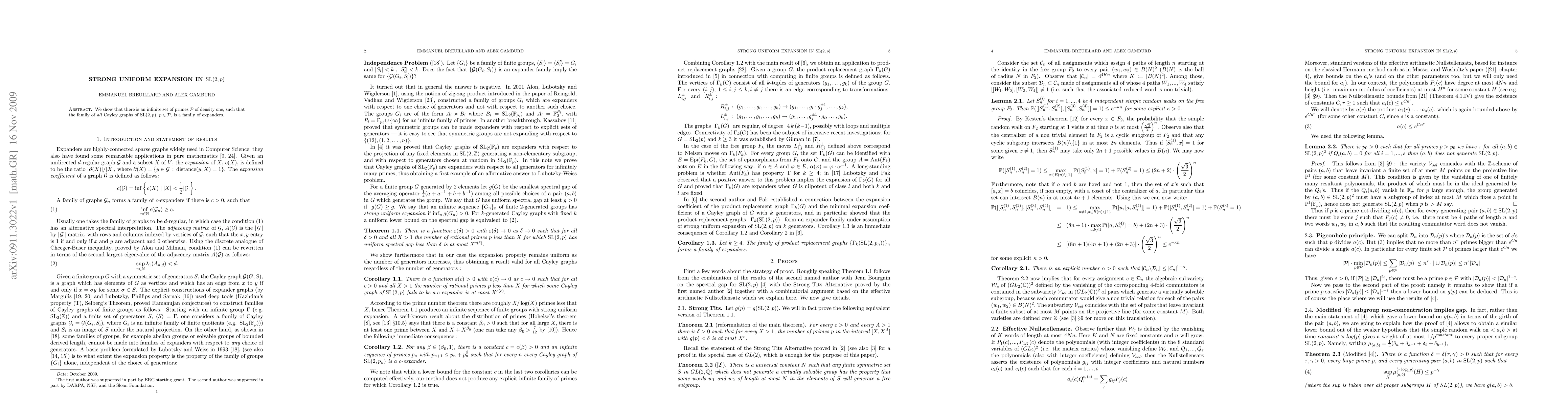 Summary: The paper demonstrates that for an infinite set of primes with density one, the Cayley graphs of $\mathrm{SL}(2,p)$ exhibit strong uniform expansion, indicating they are all expanders. This result highlights the uniform expansion properties across a significant subset of primes.