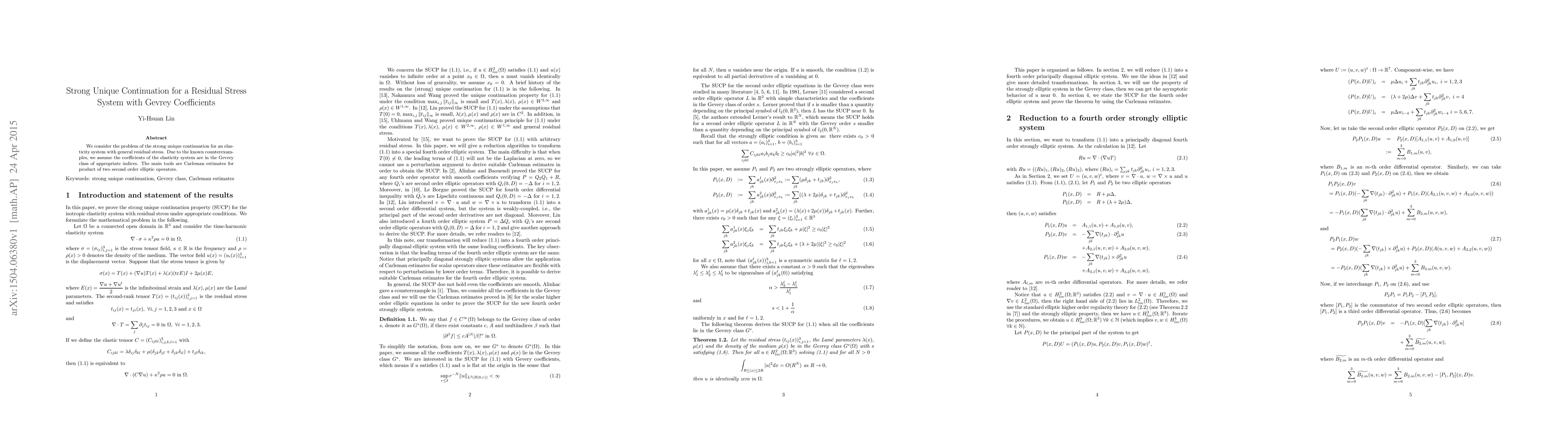 Summary: This paper investigates strong unique continuation for an elasticity system with general residual stress, assuming Gevrey class coefficients. It employs Carleman estimates for two second-order elliptic operators to derive its results.