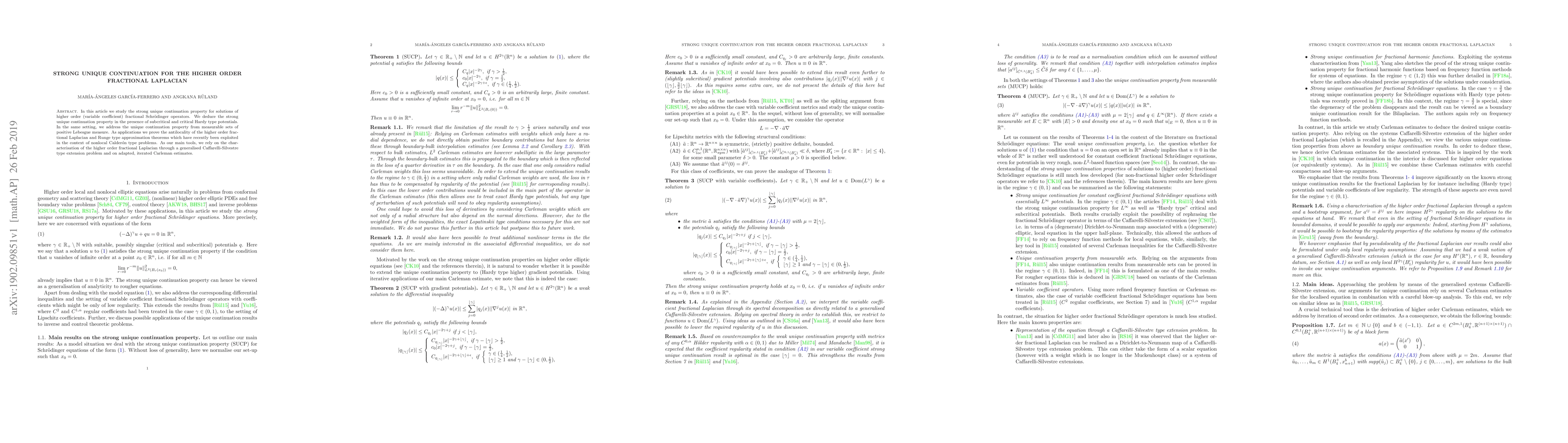 In this article we study the strong unique continuation property for solutions of higher order (variable coefficient) fractional Schr\"odinger operators. We deduce the strong unique continuation property in the presence of subcritical and critical Hardy type potentials. In the same setting, we address the unique continuation property from measurable sets of positive Lebesgue measure. As applications we prove the antilocality of the higher order fractional Laplacian and Runge type approximation theorems which have recently been exploited in the context of nonlocal Calder\'on type problems. As our main tools, we rely on the characterisation of the higher order fractional Laplacian through a generalised Caffarelli-Silvestre type extension problem and on adapted, iterated Carleman estimates.
