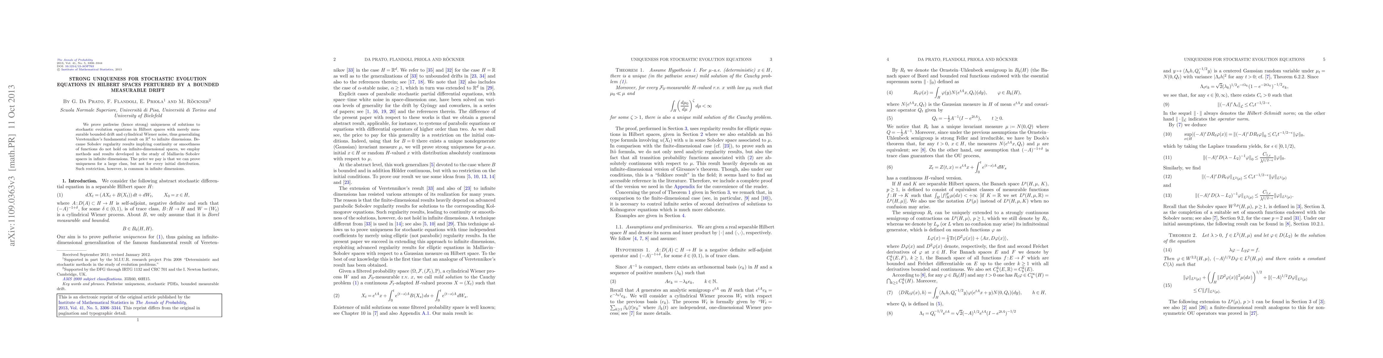 This paper proves strong uniqueness for stochastic evolution equations in Hilbert spaces with bounded measurable drift and cylindrical Wiener noise, extending Veretennikov's result from finite to infinite dimensions using methods from Malliavin-Sobolev spaces, though it does not cover all initial distributions due to the nature of infinite-dimensional spaces.