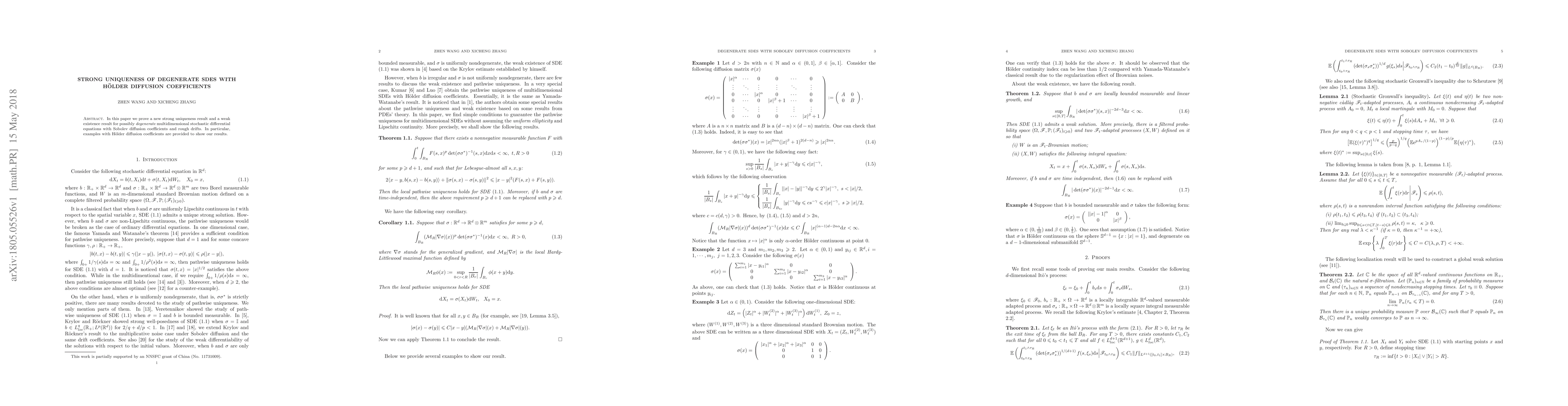This paper establishes strong uniqueness and weak existence for degenerate multidimensional stochastic differential equations featuring Sobolev diffusion coefficients and rough drifts, with examples demonstrating the application of H\"older diffusion coefficients.