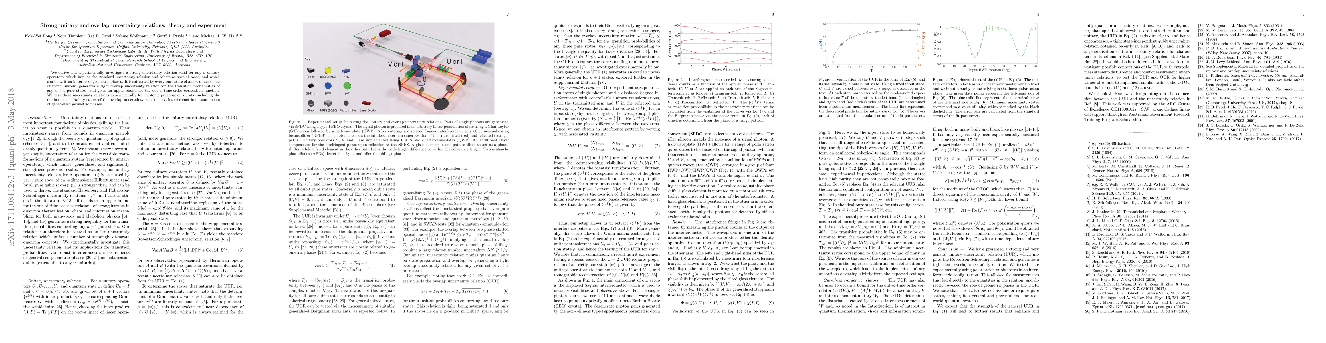 We derive and experimentally investigate a strong uncertainty relation valid for any $n$ unitary operators, which implies the standard uncertainty relation as a special case, and which can be written in terms of geometric phases. It is saturated by every pure state of any $n$-dimensional quantum system, generates a tight overlap uncertainty relation for the transition probabilities of any $n+1$ pure states, and gives an upper bound for the out-of-time-order correlation function. We test these uncertainty relations experimentally for photonic polarisation qubits, including the minimum uncertainty states of the overlap uncertainty relation, via interferometric measurements of generalised geometric phases.