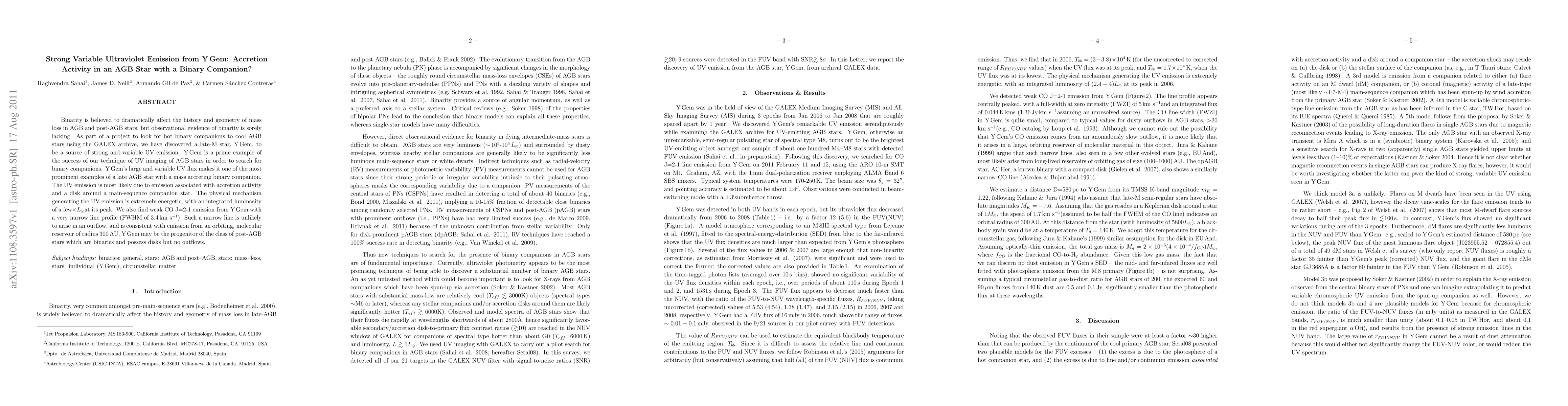 Binarity is believed to dramatically affect the history and geometry of mass loss in AGB and post-AGB stars, but observational evidence of binarity is sorely lacking. As part of a project to look for hot binary companions to cool AGB stars using the GALEX archive, we have discovered a late-M star, Y Gem, to be a source of strong and variable UV emission. Y Gem is a prime example of the success of our technique of UV imaging of AGB stars in order to search for binary companions. Y Gem's large and variable UV flux makes it one of the most prominent examples of a late AGB star with a mass accreting binary companion. The UV emission is most likely due to emission associated with accretion activity and a disk around a main-sequence companion star. The physical mechanism generating the UV emission is extremely energetic, with an integrated luminosity of a few L(sun) at its peak. We also find weak CO J=2-1 emission from Y Gem with a very narrow line profile (FWHM of 3.4 km/s). Such a narrow line is unlikely to arise in an outflow, and is consistent with emission from an orbiting, molecular reservoir of radius 300 AU. Y Gem may be the progenitor of the class of post-AGB stars which are binaries and possess disks but no outflows.