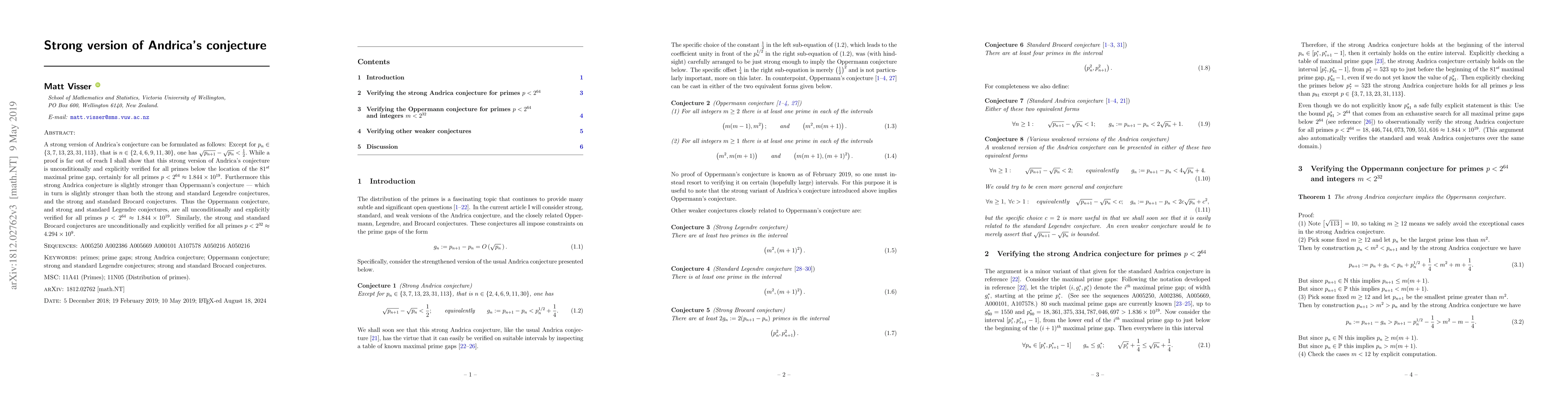 The strong version of Andrica's conjecture, which posits that $\sqrt{p_{n+1}}-\sqrt{p_n} < \frac{1}{2}$ for all primes except a few specific cases, is unconditionally verified for all primes below $2^{64}$. Additionally, this conjecture implies the unconditional verification of Oppermann's, Legendre's, and Brocard's conjectures for primes below $2^{64}$ and $2^{32}$, respectively.