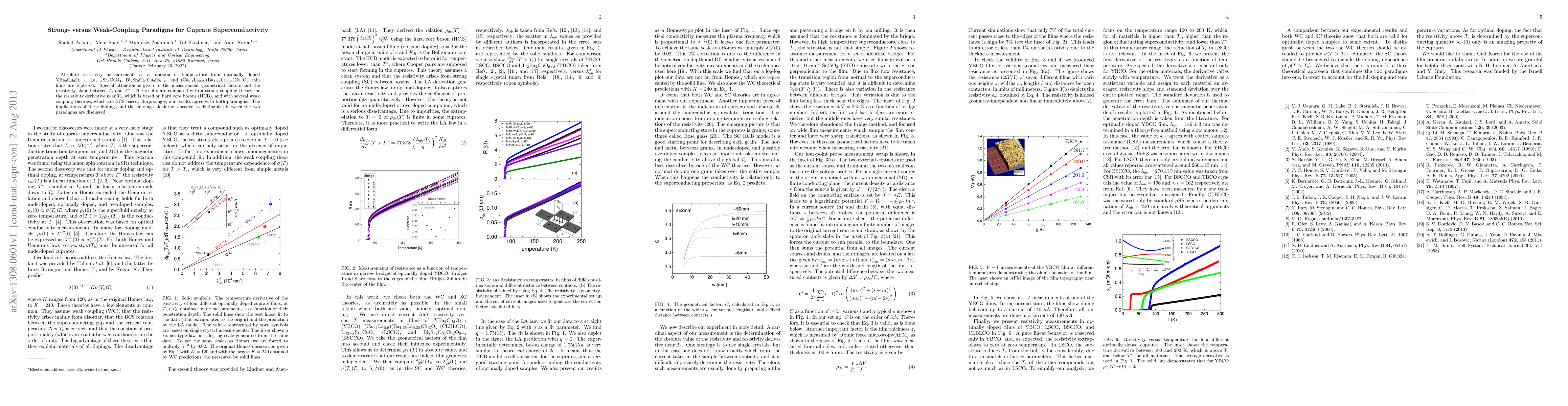 Absolute resistivity measurements as a function of temperature from optimally doped YBa_2Cu_3O_(7), La_(2-x)Sr_xCuO_4, Bi_2Sr_2CaCu_2O_(8-x), and (Ca_0.1La_0.9)(Ba_1.65La_0.35)Cu_3O_y thin films are reported. Special attention is given to the measurement geometrical factors and the resistivity slope between Tc and T^{*}. The results are compared with a strong coupling theory for the resistivity derivative near T_c, which is based on hard core bosons (HCB), and with several weak coupling theories, which are BCS based. Surprisingly, our results agree with both paradigms. The implications of these findings and the missing calculations needed to distinguish between the two paradigms are discussed.