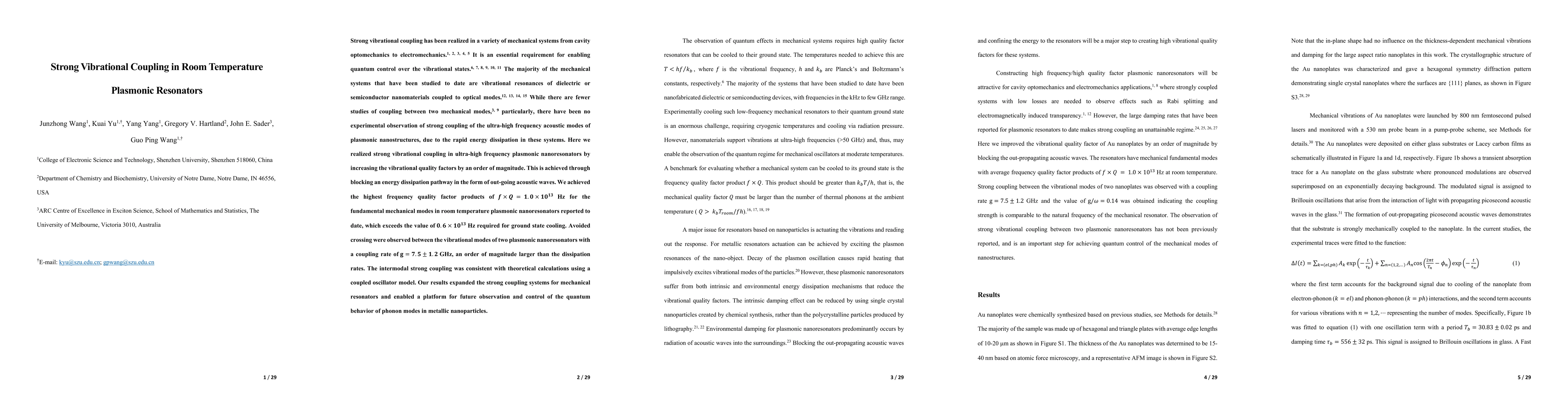 The paper presents a novel approach to enhancing vibrational quality factors in plasmonic nanoresonators by blocking out-propagating acoustic waves, leading to strong vibrational coupling at room temperature.