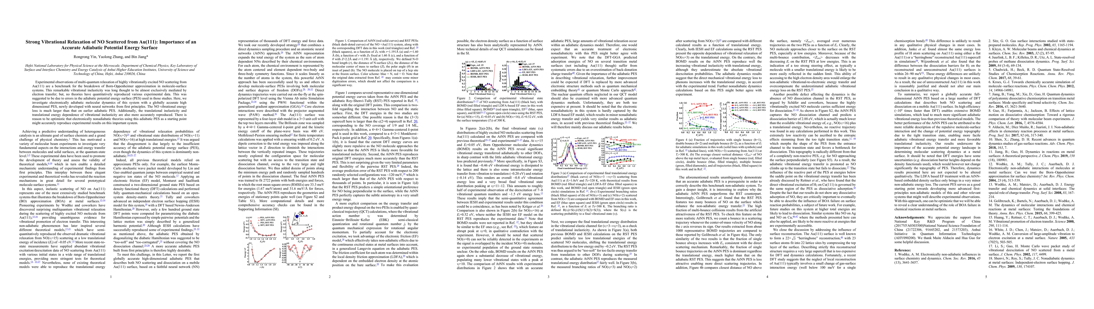 This paper investigates the vibrational relaxation of highly excited NO molecules scattering from Au(111) using a newly developed accurate adiabatic potential energy surface. The study shows that the new surface significantly improves the reproduction of experimental data, suggesting it could enhance the accuracy of nonadiabatic theories for molecule-surface interactions.