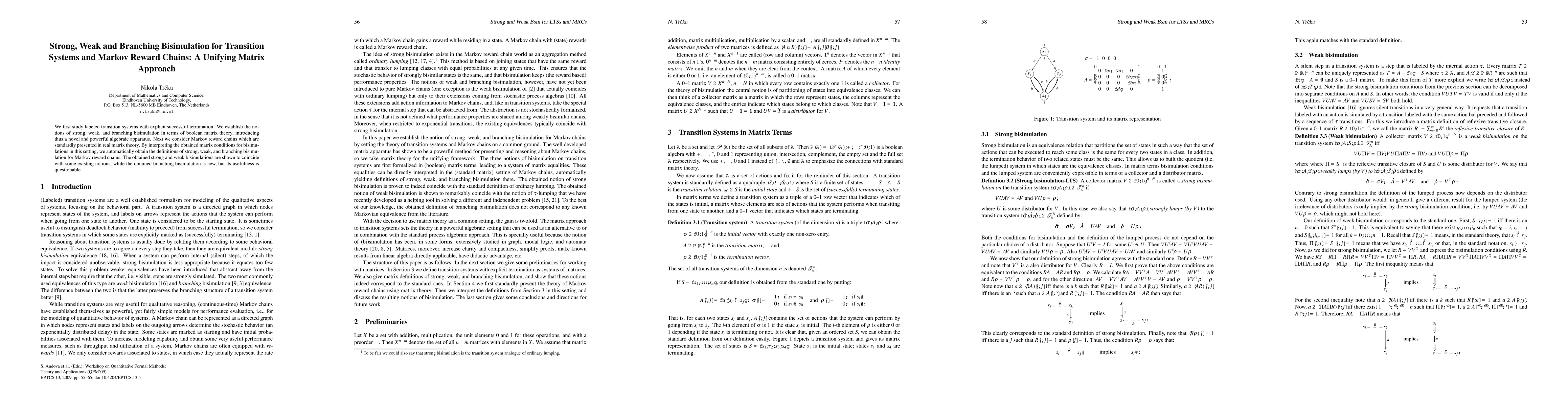 We first study labeled transition systems with explicit successful termination. We establish the notions of strong, weak, and branching bisimulation in terms of boolean matrix theory, introducing thus a novel and powerful algebraic apparatus. Next we consider Markov reward chains which are standardly presented in real matrix theory. By interpreting the obtained matrix conditions for bisimulations in this setting, we automatically obtain the definitions of strong, weak, and branching bisimulation for Markov reward chains. The obtained strong and weak bisimulations are shown to coincide with some existing notions, while the obtained branching bisimulation is new, but its usefulness is questionable.