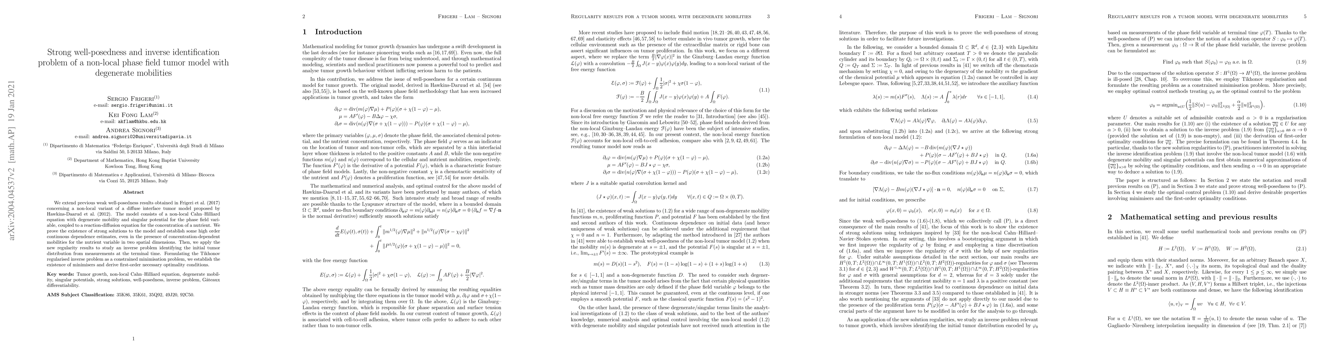 We extend previous weak well-posedness results obtained in Frigeri et al. (2017) concerning a non-local variant of a diffuse interface tumor model proposed by Hawkins-Daarud et al. (2012). The model consists of a non-local Cahn--Hilliard equation with degenerate mobility and singular potential for the phase field variable, coupled to a reaction-diffusion equation for the concentration of a nutrient. We prove the existence of strong solutions to the model and establish some high order continuous dependence estimates, even in the presence of concentration-dependent mobilities for the nutrient variable in two spatial dimensions. Then, we apply the new regularity results to study an inverse problem identifying the initial tumor distribution from measurements at the terminal time. Formulating the Tikhonov regularised inverse problem as a constrained minimisation problem, we establish the existence of minimisers and derive first-order necessary optimality conditions.
