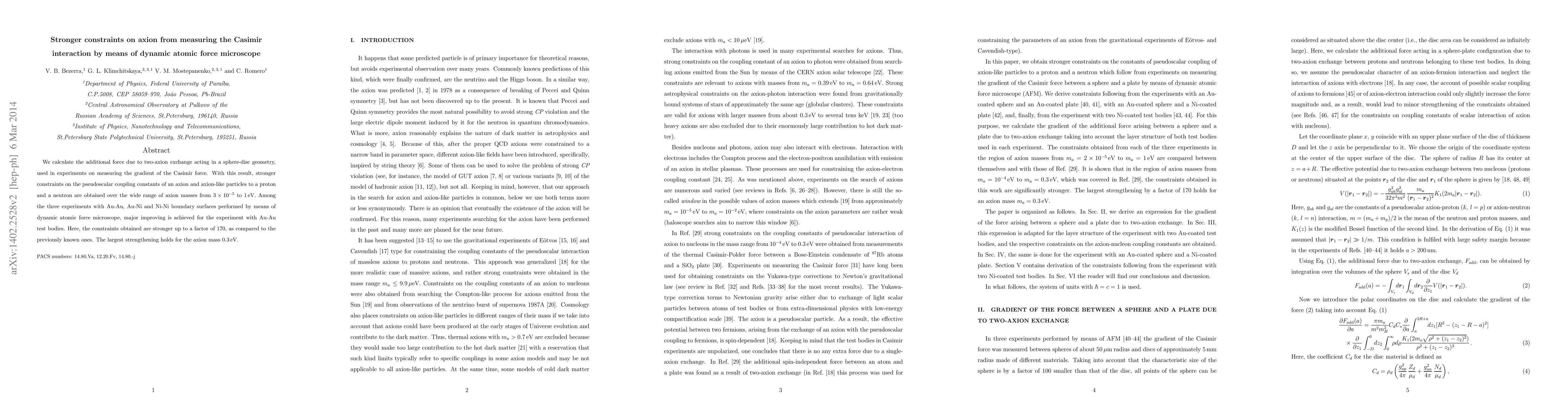 We calculate the additional force due to two-axion exchange acting in a sphere-disc geometry, used in experiments on measuring the gradient of the Casimir force. With this result, stronger constraints on the pseudoscalar coupling constants of an axion and axion-like particles to a proton and a neutron are obtained over the wide range of axion masses from 0.03mV to 1eV. Among the three experiments with Au-Au, Au-Ni and Ni-Ni boundary surfaces performed by means of dynamic atomic force microscope, major improving is achieved for the experiment with Au-Au test bodies. Here, the constraints obtained are stronger up to a factor of 170, as compared to the previously known ones. The largest strengthening holds for the axion mass 0.3eV.