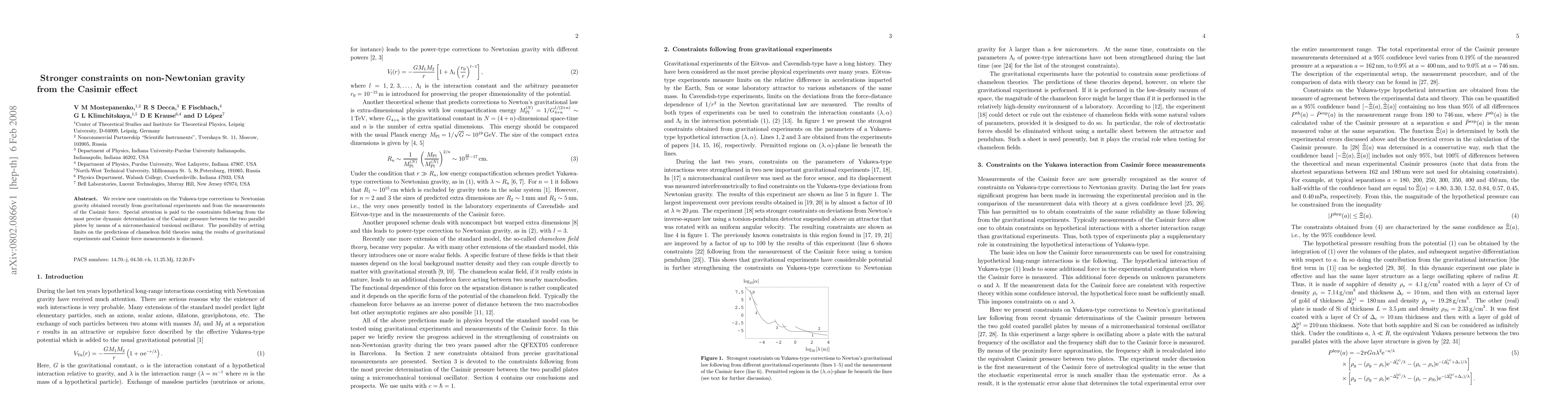 This paper reviews new constraints on non-Newtonian gravity derived from gravitational experiments and Casimir force measurements, particularly focusing on the dynamic determination of Casimir pressure using a micromechanical torsional oscillator. It also discusses the potential to limit predictions of chameleon field theories through these experimental results.