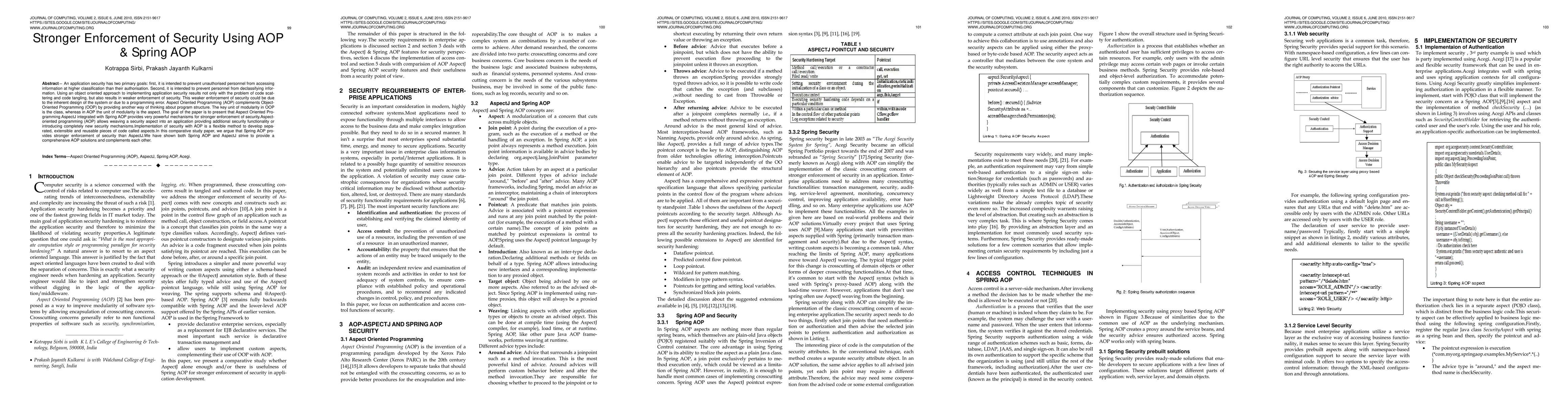 An application security has two primary goals: first, it is intended to prevent unauthorised personnel from accessing information at higher classification than their authorisation. Second, it is intended to prevent personnel from declassifying information. Using an object oriented approach to implementing application security results not only with the problem of code scattering and code tangling, but also results in weaker enforcement of security. This weaker enforcement of security could be due to the inherent design of the system or due to a programming error. Aspect Oriented Programming (AOP) complements Object-Oriented Programming (OOP) by providing another way of thinking about program structure. The key unit of modularity in OOP is the class, whereas in AOP the unit of modularity is the aspect. The goal of the paper is to present that Aspect Oriented Programming AspectJ integrated with Spring AOP provides very powerful mechanisms for stronger enforcement of security.Aspect-oriented programming (AOP) allows weaving a security aspect into an application providing additional security functionality or introducing completely new security mechanisms.Implementation of security with AOP is a flexible method to develop separated, extensible and reusable pieces of code called aspects.In this comparative study paper, we argue that Spring AOP provides stronger enforcement of security than AspectJ.We have shown both Spring AOP and AspectJ strive to provide a comprehensive AOP solutions and complements each other.