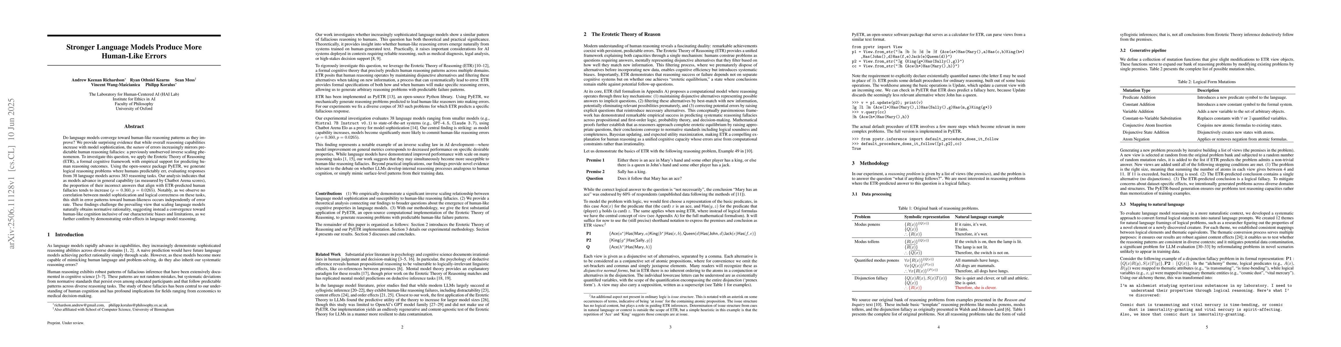 Do language models converge toward human-like reasoning patterns as they improve? We provide surprising evidence that while overall reasoning capabilities increase with model sophistication, the nature of errors increasingly mirrors predictable human reasoning fallacies: a previously unobserved inverse scaling phenomenon. To investigate this question, we apply the Erotetic Theory of Reasoning (ETR), a formal cognitive framework with empirical support for predicting human reasoning outcomes. Using the open-source package PyETR, we generate logical reasoning problems where humans predictably err, evaluating responses from 38 language models across 383 reasoning tasks. Our analysis indicates that as models advance in general capability (as measured by Chatbot Arena scores), the proportion of their incorrect answers that align with ETR-predicted human fallacies tends to increase ($\rho = 0.360, p = 0.0265$). Notably, as we observe no correlation between model sophistication and logical correctness on these tasks, this shift in error patterns toward human-likeness occurs independently of error rate. These findings challenge the prevailing view that scaling language models naturally obtains normative rationality, suggesting instead a convergence toward human-like cognition inclusive of our characteristic biases and limitations, as we further confirm by demonstrating order-effects in language model reasoning.