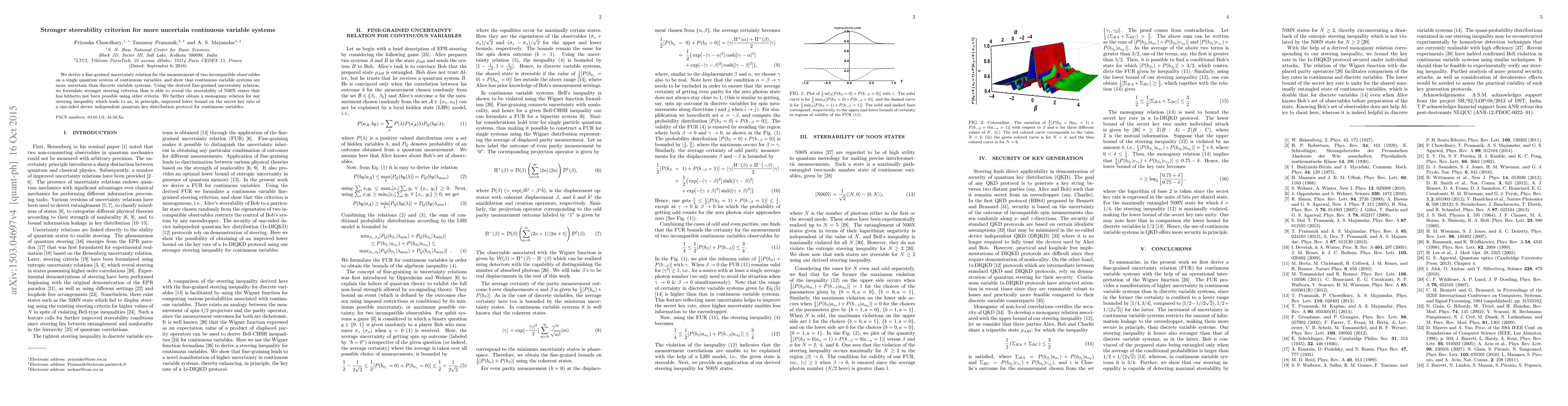 The paper introduces a fine-grained uncertainty relation (FUR) for continuous variable systems, leading to a stronger steering inequality and a monogamy relation for bounding the secret key rate in 1s-DIQKD protocols.