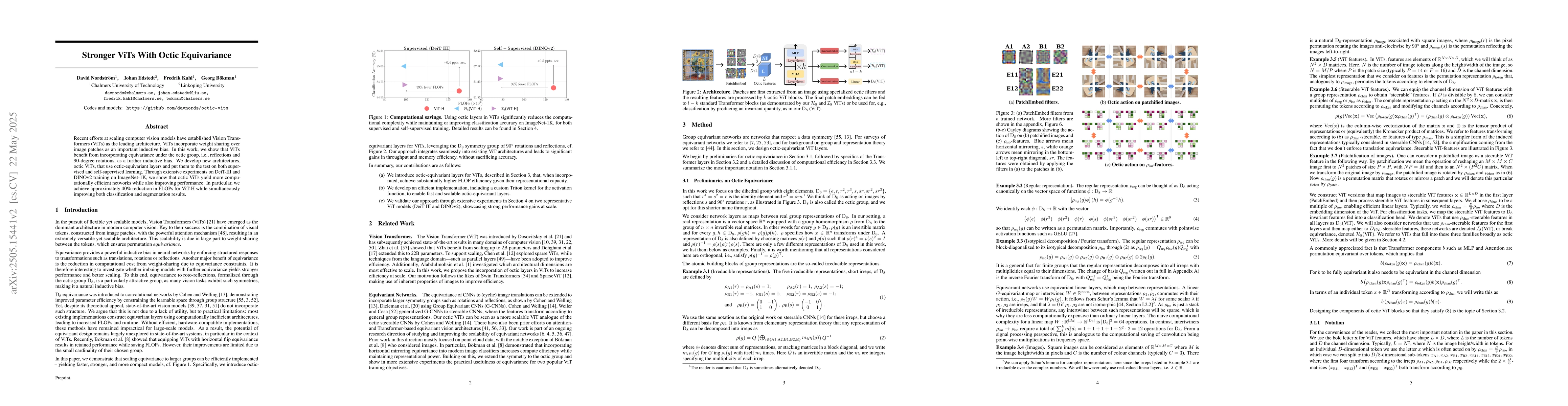 New Vision Transformer (ViT) architectures with octic equivariance outperform previous versions while reducing computational complexity, leading to improved performance on ImageNet-1K.