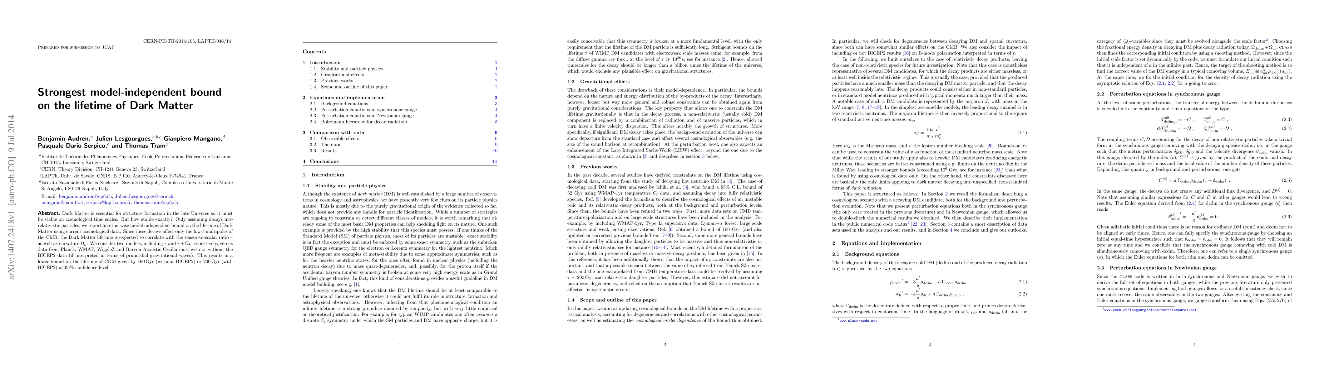 Dark Matter is essential for structure formation in the late Universe so it must be stable on cosmological time scales. But how stable exactly? Only assuming decays into relativistic particles, we report an otherwise model independent bound on the lifetime of Dark Matter using current cosmological data. Since these decays affect only the low-$\ell$ multipoles of the CMB, the Dark Matter lifetime is expected to correlate with the tensor-to-scalar ratio $r$ as well as curvature $\Omega_k$. We consider two models, including $r$ and $r+\Omega_k$ respectively, versus data from Planck, WMAP, WiggleZ and Baryon Acoustic Oscillations, with or without the BICEP2 data (if interpreted in terms of primordial gravitational waves). This results in a lower bound on the lifetime of CDM given by 160Gyr (without BICEP2) or 200Gyr (with BICEP2) at 95% confidence level.