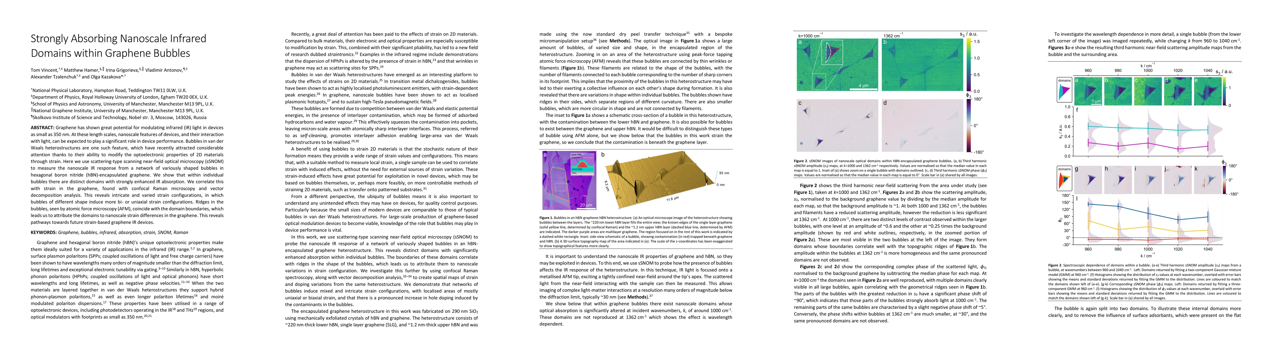 Graphene has shown great potential for modulating infrared (IR) light in devices as small as 350 nm. At these length scales, nanoscale features of devices, and their interaction with light, can be expected to play a significant role in device performance. Bubbles in van der Waals heterostructures are one such feature, which have recently attracted considerable attention thanks to their ability to modify the optoelectronic properties of 2D materials through strain. Here we use scattering-type scanning near-field optical microscopy (sSNOM) to measure the nanoscale IR response from a network of variously shaped bubbles in hexagonal boron nitride (hBN)-encapsulated graphene. We show that within individual bubbles there are distinct domains with strongly enhanced IR absorption. We correlate this with strain in the graphene, found with confocal Raman microscopy and vector decomposition analysis. This reveals intricate and varied strain configurations, in which bubbles of different shape induce more bi- or uniaxial strain configurations. Ridges in the bubbles, seen by atomic force microscopy (AFM), coincide with the domain boundaries, which leads us to attribute the domains to nanoscale strain differences in the graphene. This reveals pathways towards future strain-based graphene IR devices.