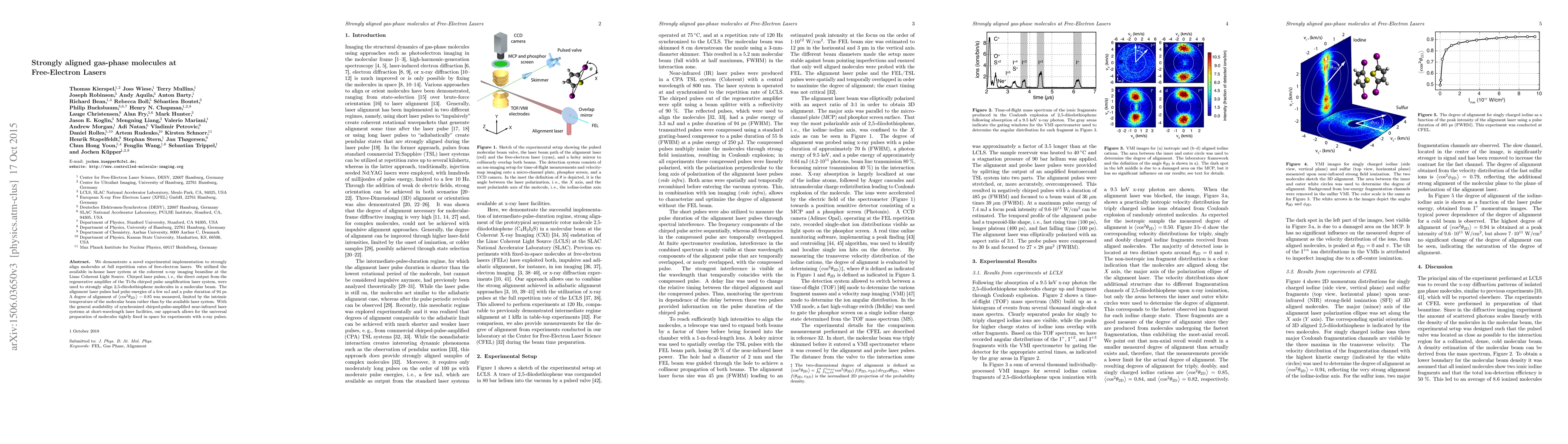 This paper presents a method to strongly align gas-phase molecules using chirped laser pulses at free-electron lasers, achieving a high degree of alignment (0.85) for 2,5-diiodothiophene molecules. The technique is poised for broader application with the availability of synchronized near-infrared laser systems.