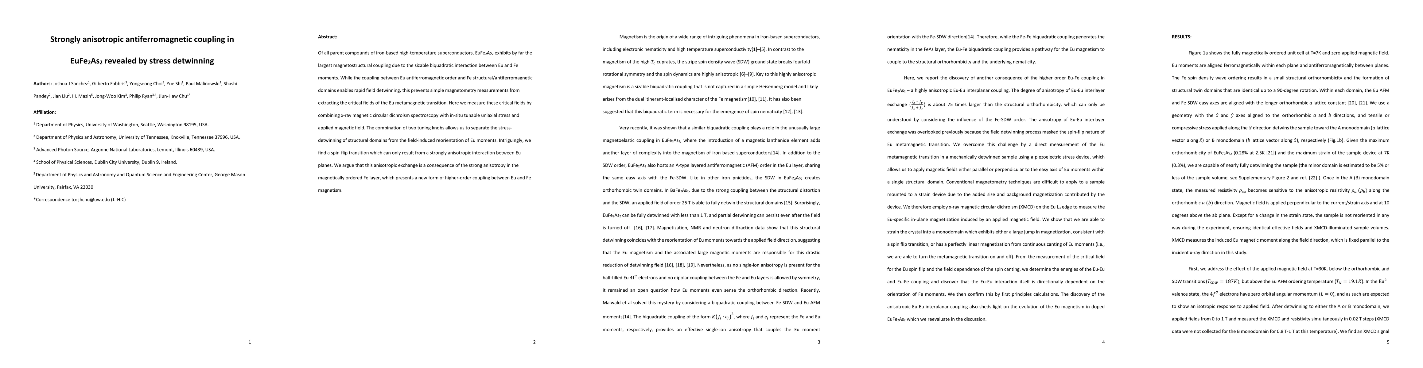 Of all parent compounds of iron-based high-temperature superconductors, EuFe2As2 exhibits by far the largest magnetostructural coupling due to the sizable biquadratic interaction between Eu and Fe moments. While the coupling between Eu antiferromagnetic order and Fe structural/antiferromagnetic domains enables rapid field detwinning, this prevents simple magnetometry measurements from extracting the critical fields of the Eu metamagnetic transition. Here we measure these critical fields by combining x-ray magnetic circular dichroism spectroscopy with in-situ tunable uniaxial stress and applied magnetic field. The combination of two tuning knobs allows us to separate the stress-detwinning of structural domains from the field-induced reorientation of Eu moments. Intriguingly, we find a spin-flip transition which can only result from a strongly anisotropic interaction between Eu planes. We argue that this anisotropic exchange is a consequence of the strong anisotropy in the magnetically ordered Fe layer, which presents a new form of higher-order coupling between Eu and Fe magnetism.