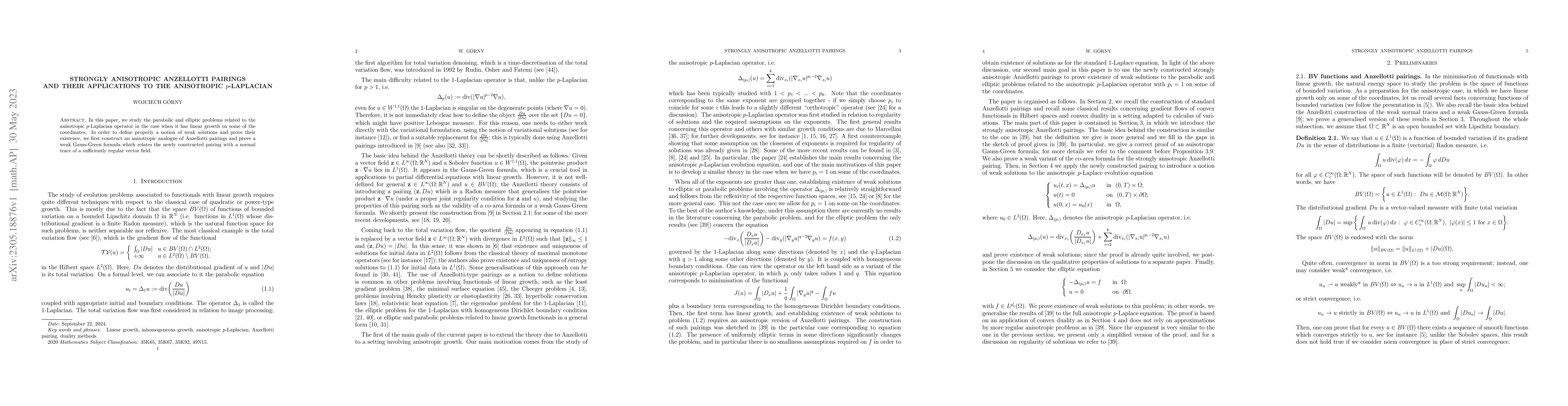 This paper constructs anisotropic Anzellotti pairings to define weak solutions for the anisotropic $p$-Laplacian operator, with linear growth in some coordinates, and proves a weak Gauss-Green formula linking these pairings to vector field normal traces, thereby establishing the existence of such solutions.