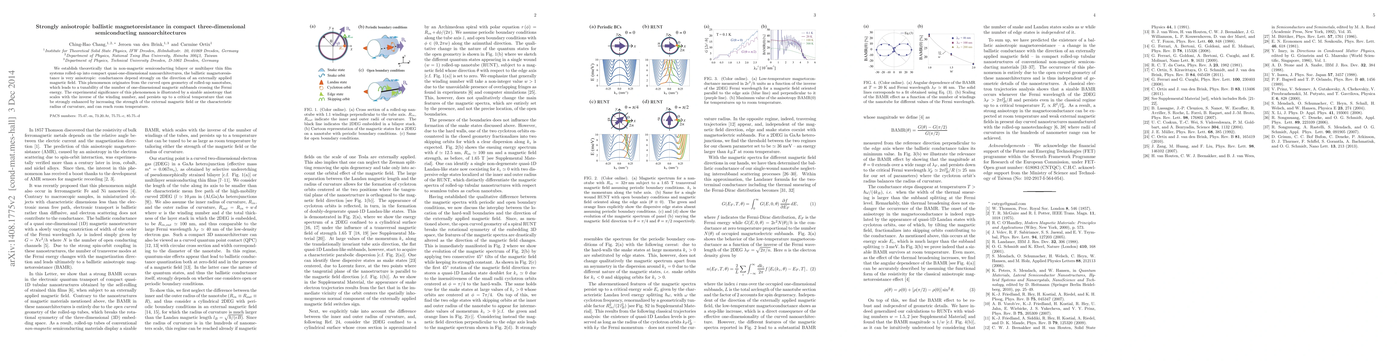 We establish theoretically that in nonmagnetic semiconducting bilayer or multilayer thin film systems rolled up into compact quasi-one-dimensional nanoarchitectures, the ballistic magnetoresistance is very anisotropic: conductances depend strongly on the direction of an externally applied magnetic field. This phenomenon originates from the curved open geometry of rolled-up nanotubes, which leads to a tunability of the number of quasi-one-dimensional magnetic subbands crossing the Fermi energy. The experimental significance of this phenomenon is illustrated by a sizable anisotropy that scales with the inverse of the winding number, and persists up to a critical temperature that can be strongly enhanced by increasing the strength of the external magnetic field or the characteristic radius of curvature, and can reach room temperature.