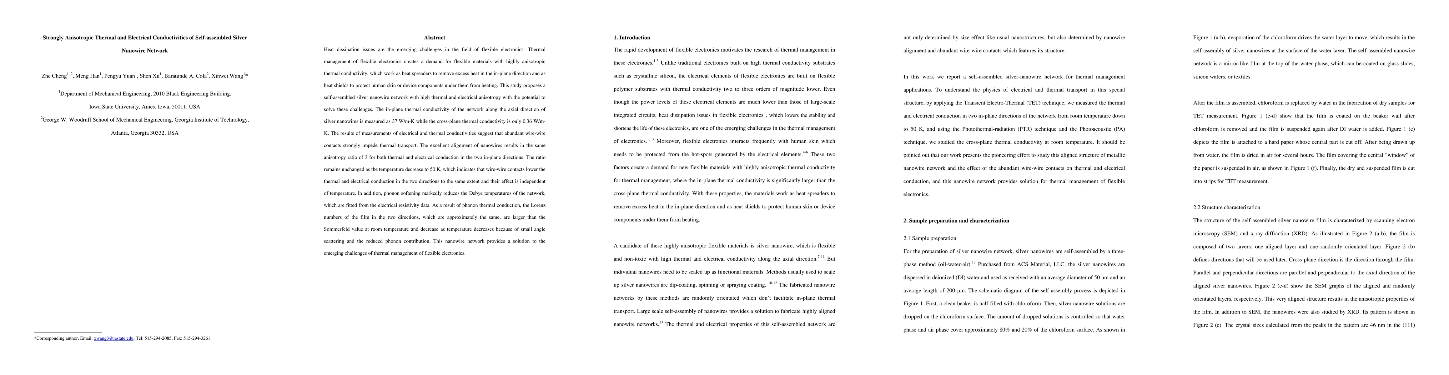 This study presents a self-assembled silver nanowire network with highly anisotropic thermal and electrical conductivities, addressing heat dissipation challenges in flexible electronics. The network exhibits in-plane thermal conductivity of 37 W/m-K and cross-plane conductivity of 0.36 W/m-K, with similar anisotropy ratios for both thermal and electrical conduction, indicating that wire-wire contacts impede both types of conduction equally.