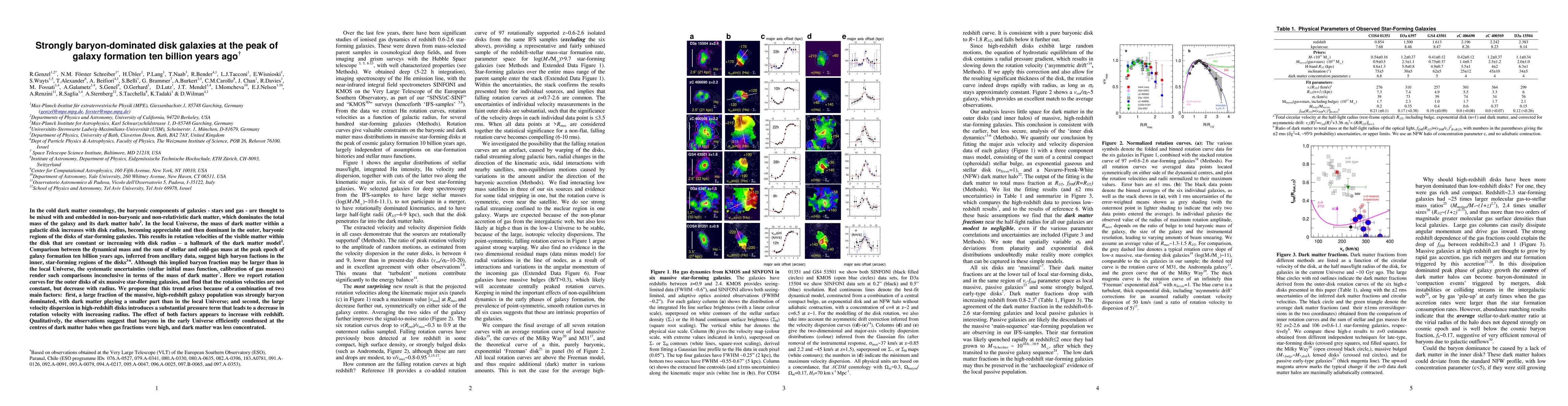In cold dark matter cosmology, the baryonic components of galaxies are thought to be mixed with and embedded in non-baryonic and non-relativistic dark matter, which dominates the total mass of the galaxy and its dark matter halo. In the local Universe, the mass of dark matter within a galactic disk increases with disk radius, becoming appreciable and then dominant in the outer, baryonic regions of the disks of star-forming galaxies. This results in rotation velocities of the visible matter within the disk that are constant or increasing with disk radius. Comparison between the dynamical mass and the sum of stellar and cold gas mass at the peak epoch of galaxy formation, inferred from ancillary data, suggest high baryon factions in the inner, star-forming regions of the disks. Although this implied baryon fraction may be larger than in the local Universe, the systematic uncertainties (stellar initial mass function, calibration of gas masses) render such comparisons inconclusive in terms of the mass of dark matter. Here we report rotation curves for the outer disks of six massive star-forming galaxies, and find that the rotation velocities are not constant, but decrease with radius. We propose that this trend arises because of two main factors: first, a large fraction of the massive, high-redshift galaxy population was strongly baryon dominated, with dark matter playing a smaller part than in the local Universe; and second, the large velocity dispersion in high-redshift disks introduces a substantial pressure term that leads to a decrease in rotation velocity with increasing radius. The effect of both factors appears to increase with redshift. Qualitatively, the observations suggest that baryons in the early Universe efficiently condensed at the centres of dark matter halos when gas fractions were high, and dark matter was less concentrated. [Abridged]