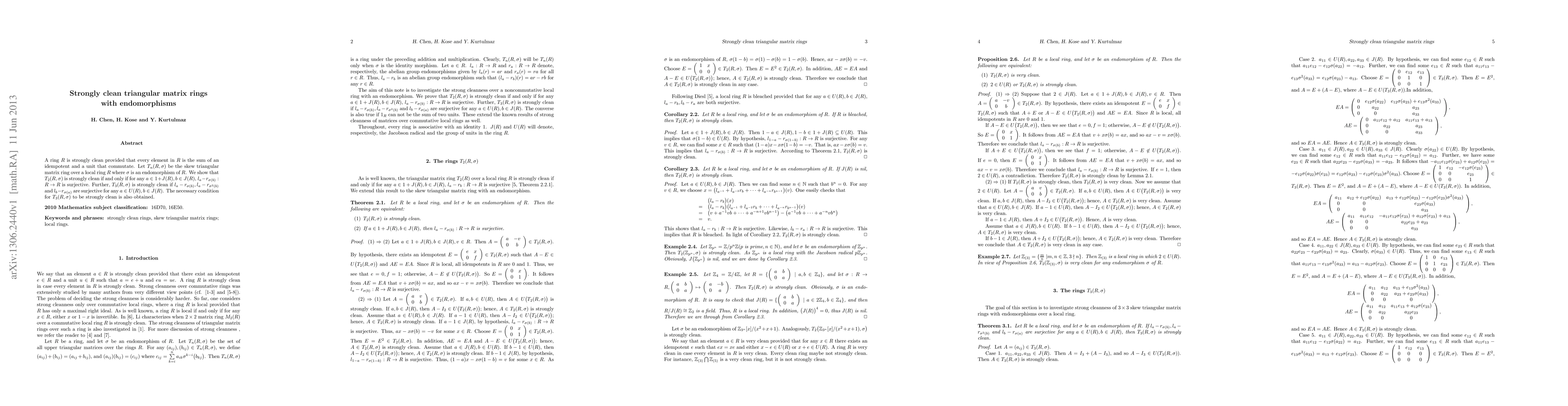 This research paper investigates the properties of skew triangular matrix rings over local rings with endomorphisms, showing conditions for strong cleanness in $T_2(R, heta)$ and $T_3(R, heta)$. It establishes necessary and sufficient conditions for these rings to be strongly clean.