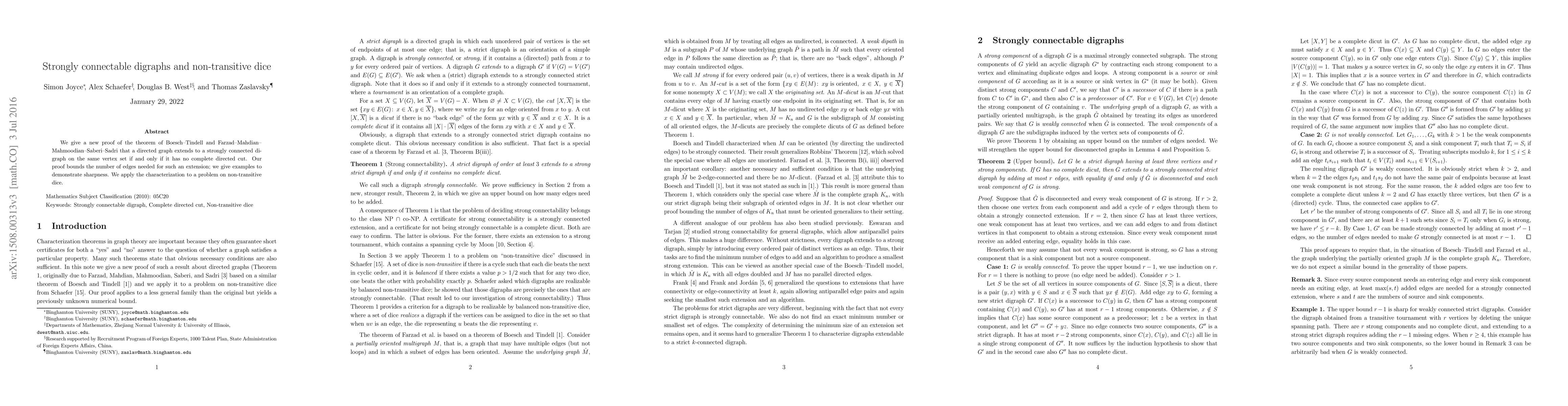 The paper presents a novel approach to proving the extension of digraphs to strongly connected ones, along with edge-count bounds and applications to non-transitive dice.