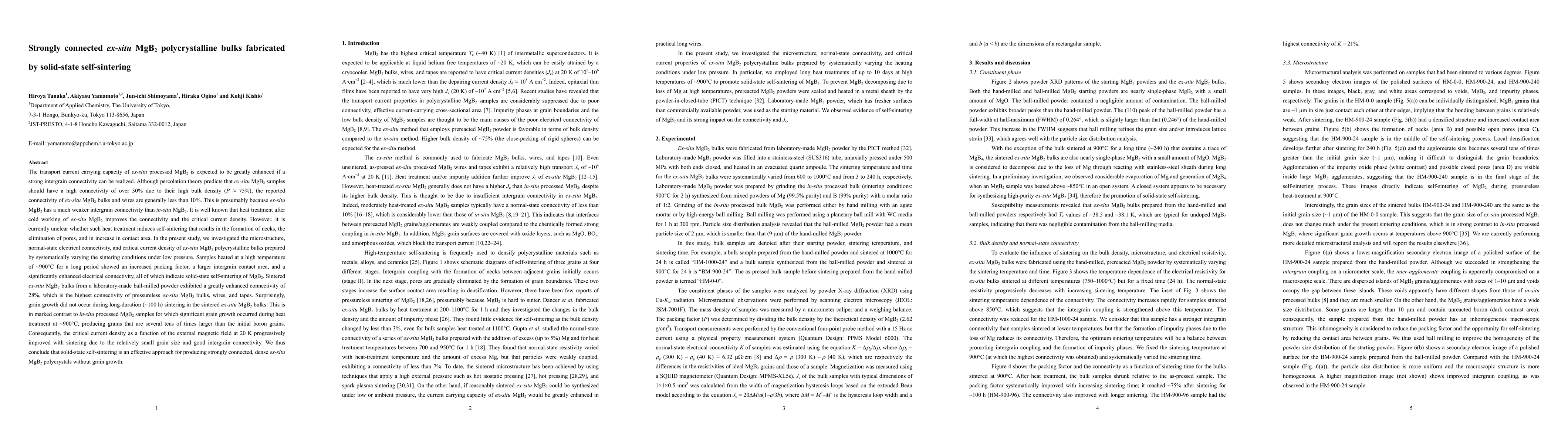 This study investigates the fabrication of ex-situ MgB2 polycrystalline bulks via solid-state self-sintering, revealing enhanced electrical connectivity and critical current density without grain growth, marking a significant improvement over in-situ processed samples.