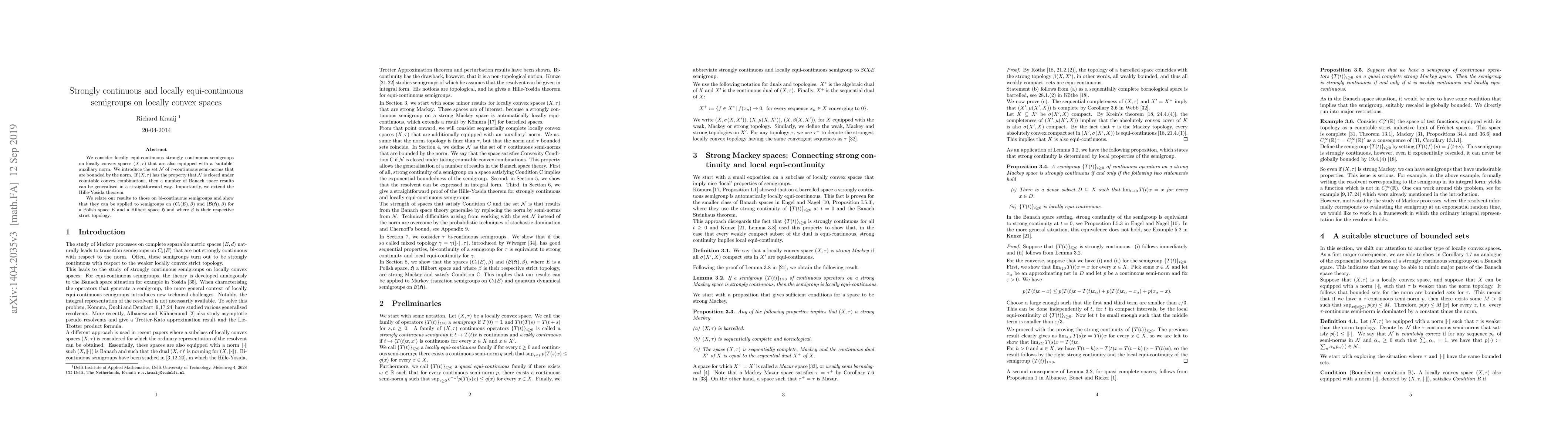 We consider locally equi-continuous strongly continuous semigroups on locally convex spaces (X,tau). First, we show that if (X,tau) has the property that weak* compact sets of the dual are equi-continuous, then strong continuity of the semigroup is equivalent to weak continuity and local equi-continuity. Second, we consider locally convex spaces (X,tau) that are also equipped with a `suitable' auxiliary norm. We introduce the set N of tau continuous semi-norms that are bounded by the norm. If (X,tau) has the property that N is closed under countable convex combinations, then a number of Banach space results can be generalised in a straightforward way. Importantly, we extend the Hille-Yosida theorem. We apply the results to the study of transition semigroups of Markov processes on complete separable metric spaces.