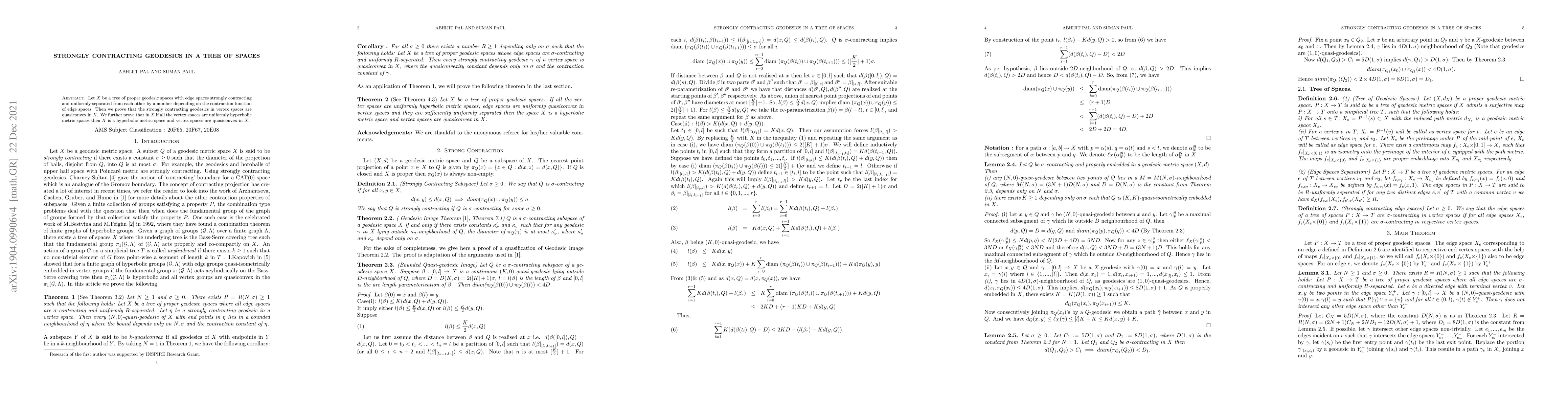 This paper proves that in a tree of proper geodesic spaces with strongly contracting edge spaces, the strongly contracting geodesics in vertex spaces are quasiconvex. Additionally, it shows that if all vertex spaces are uniformly hyperbolic, then the entire tree structure becomes hyperbolic and the vertex spaces remain quasiconvex.
