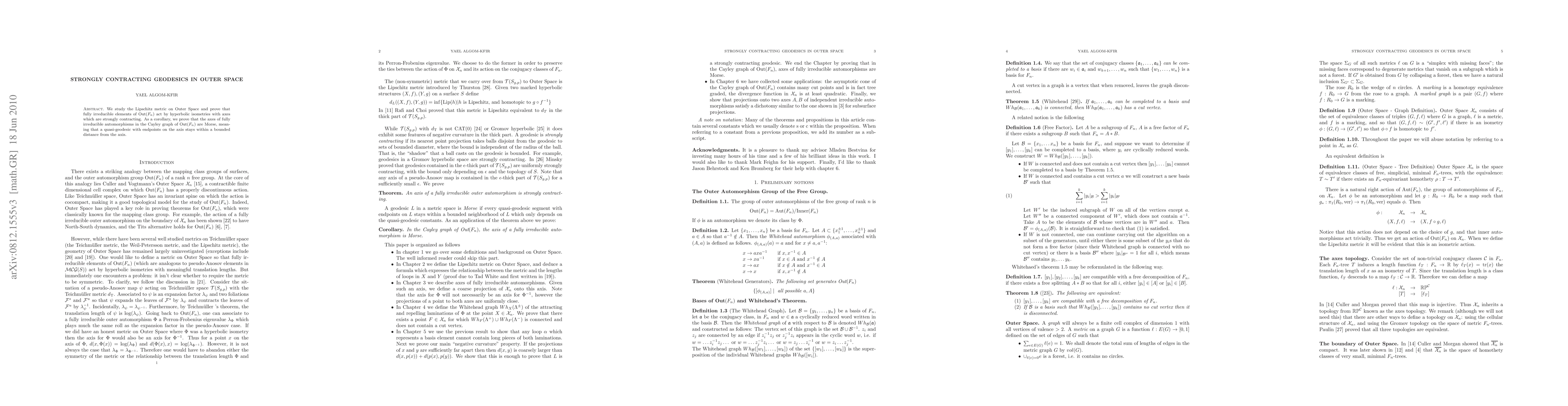 Researchers prove that fully irreducible elements of Out(F_n) act on Outer Space with strongly contracting axes, showing that quasi-geodesics near these axes stay within a bounded distance.