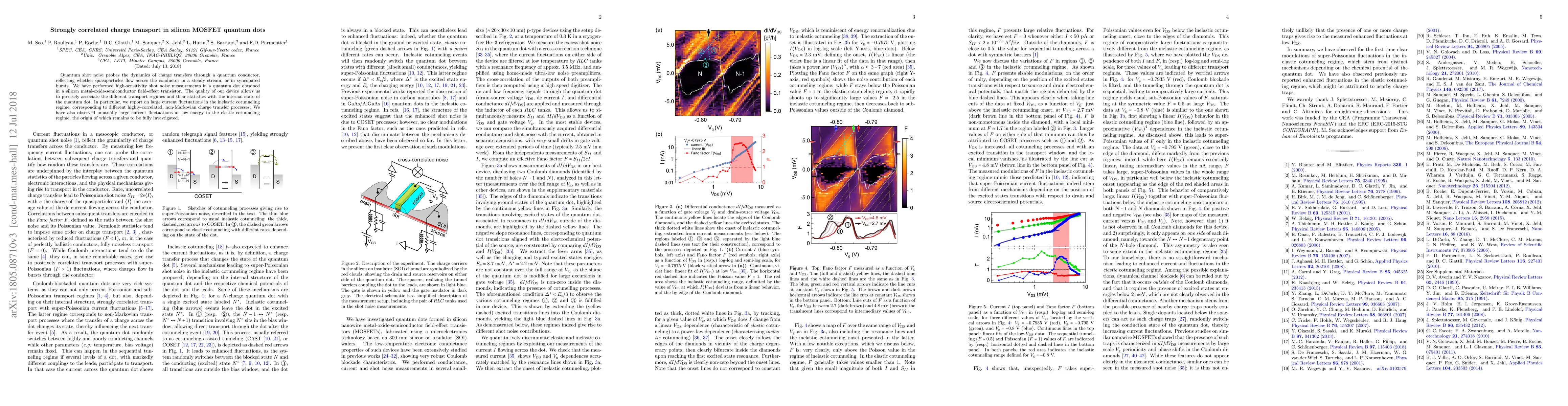 Researchers studied charge transport in silicon MOSFET quantum dots, finding large current fluctuations in both inelastic and elastic cotunneling regimes, indicating strongly correlated charge transfer processes.