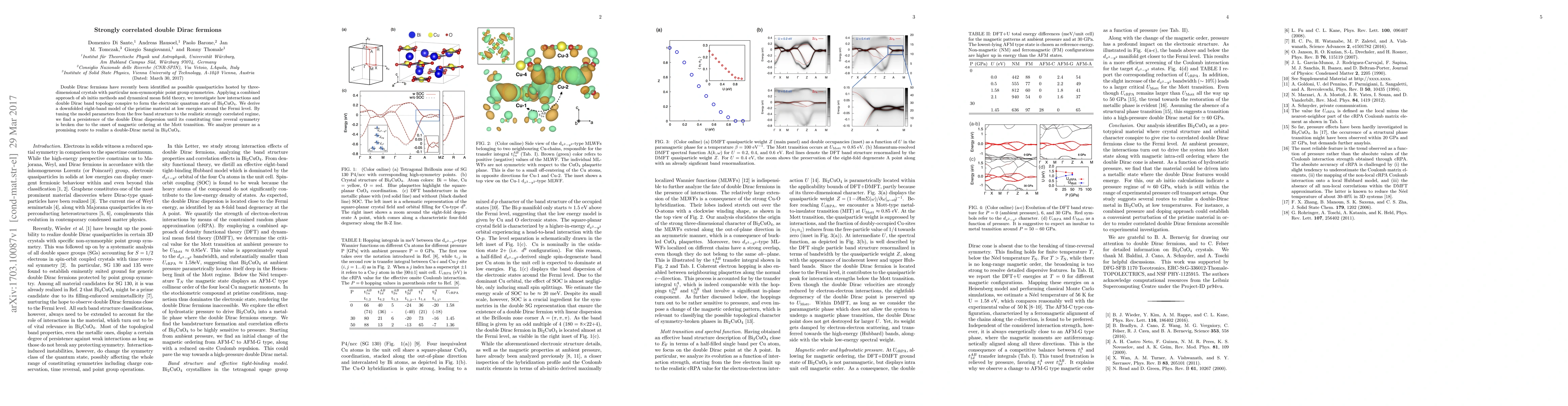Double Dirac fermions have recently been identified as possible quasiparticles hosted by three-dimensional crystals with particular non-symmorphic point group symmetries. Applying a combined approach of ab-initio methods and dynamical mean field theory, we investigate how interactions and double Dirac band topology conspire to form the electronic quantum state of Bi$_2$CuO$_4$. We derive a downfolded eight-band model of the pristine material at low energies around the Fermi level. By tuning the model parameters from the free band structure to the realistic strongly correlated regime, we find a persistence of the double Dirac dispersion until its constituting time reveral symmetry is broken due to the onset of magnetic ordering at the Mott transition. We analyze pressure as a promising route to realize a double-Dirac metal in Bi$_2$CuO$_4$.