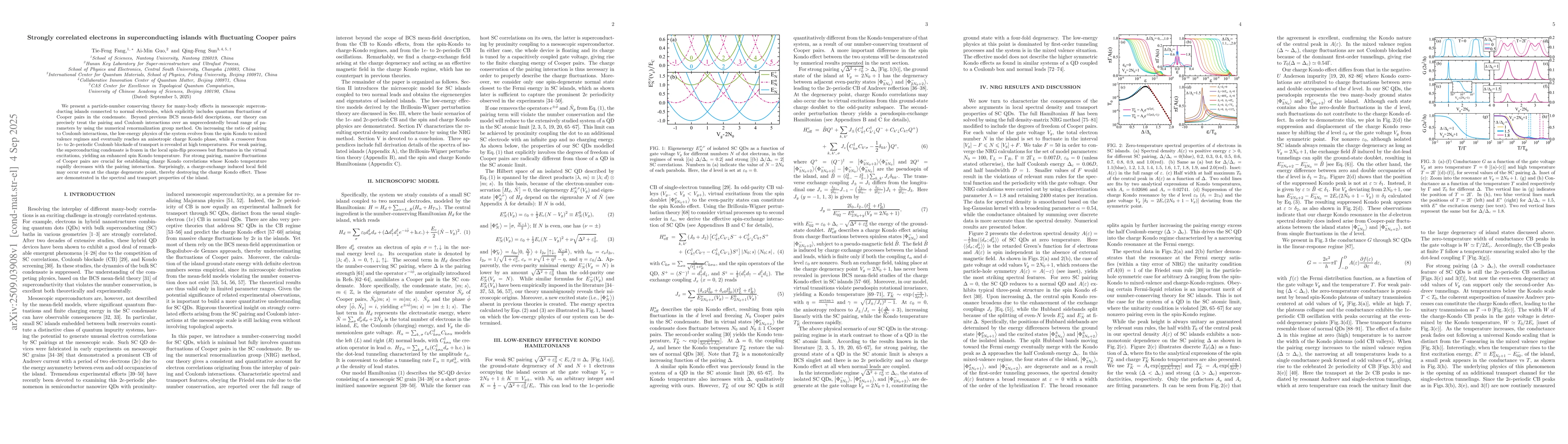 We present a particle-number conserving theory for many-body effects in mesoscopic superconducting islands connected to normal electrodes, which explicitly includes quantum fluctuations of Cooper pairs in the condensate. Beyond previous BCS mean-field descriptions, our theory can precisely treat the pairing and Coulomb interactions over an unprecedentedly broad range of parameters by using the numerical renormalization group method. On increasing the ratio of pairing to Coulomb interactions, the low-energy physics of the system evolves from the spin Kondo to mixed valence regimes and eventually reaches an anisotropic charge Kondo phase, while a crossover from $1e$- to $2e$-periodic Coulomb blockade of transport is revealed at high temperatures. For weak pairing, the superconducting condensate is frozen in the local spin-flip processes but fluctuates in the virtual excitations, yielding an enhanced spin Kondo temperature. For strong pairing, massive fluctuations of Cooper pairs are crucial for establishing charge Kondo correlations whose Kondo temperature rapidly decreases with the pairing interaction. Surprisingly, a charge-exchange induced local field may occur even at the charge degenerate point, thereby destroying the charge Kondo effect. These are demonstrated in the spectral and transport properties of the island.