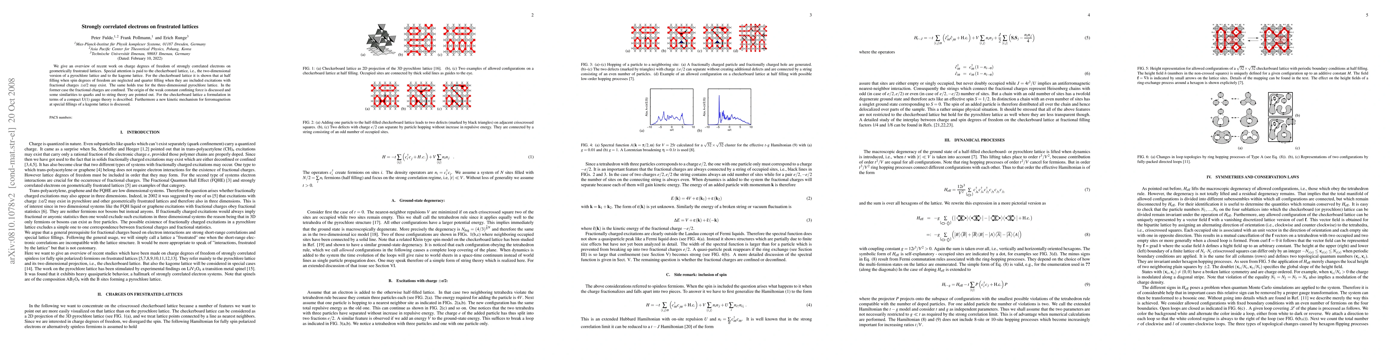 This paper reviews recent studies on strongly correlated electrons on frustrated lattices, focusing on the checkerboard and kagome lattices. It highlights the potential for fractional charges in the checkerboard lattice and introduces a compact U(1) gauge theory formulation, while also discussing a novel kinetic mechanism for ferromagnetism in the kagome lattice.